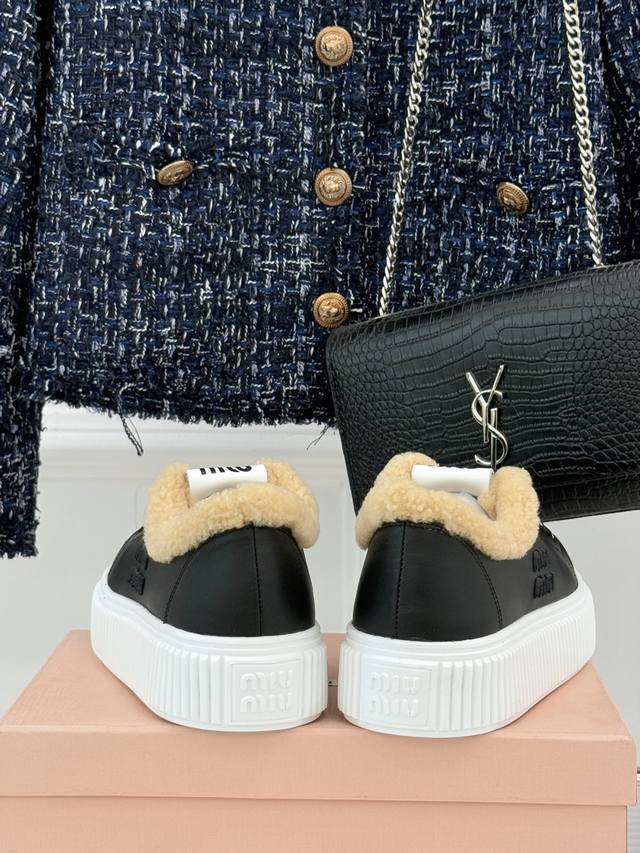 厂价 Miu Miu 缪缪25Wf新品羊毛休闲 厚底饼干鞋 当羊毛的暖糯邂逅饼干鞋的复古基因 这双饼干鞋鞋便成了甜酷少女的冬日专属 标志性的波浪纹厚底复刻经典饼干轮廓 约3.5Cm的鞋跟悄悄拉长腿部线条 小个子也能轻松拥有优越比例。 鞋面甄选细腻羊毛材质,温柔包裹双脚, 搭配羊皮毛一体内里 将暖意牢牢锁在鞋内 北方的寒冬也能肆意出行 鞋舌与鞋跟处印刷徽标 低调泄露品牌身份 与圆润鞋头相得益彰 尽显乖巧少女感 橡胶五角星纹路大底兼顾防滑与回弹 行走时轻盈无负担 逛街暴走也不会累脚。 无论是搭配卫裤、牛仔裤打