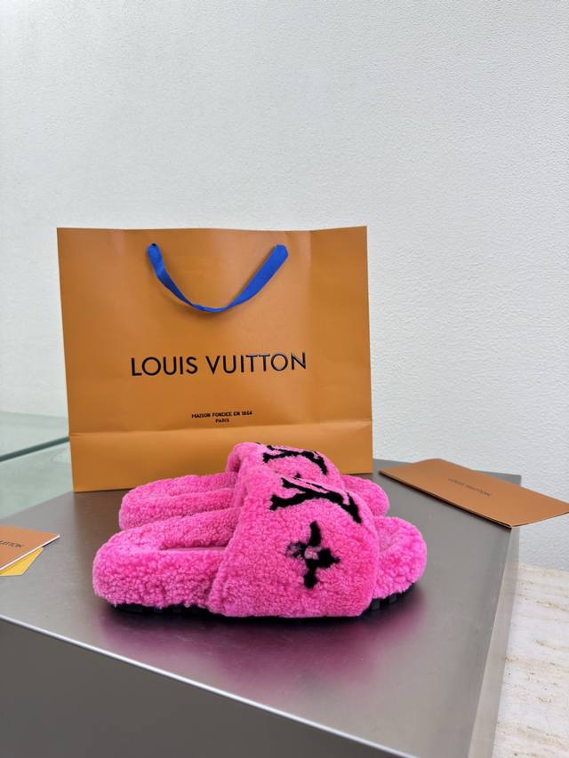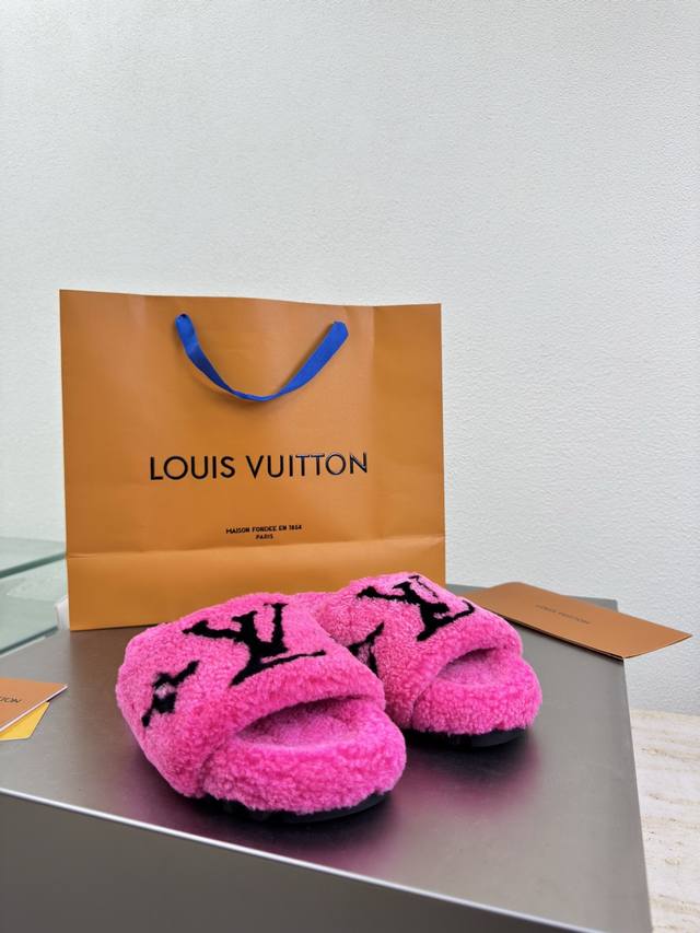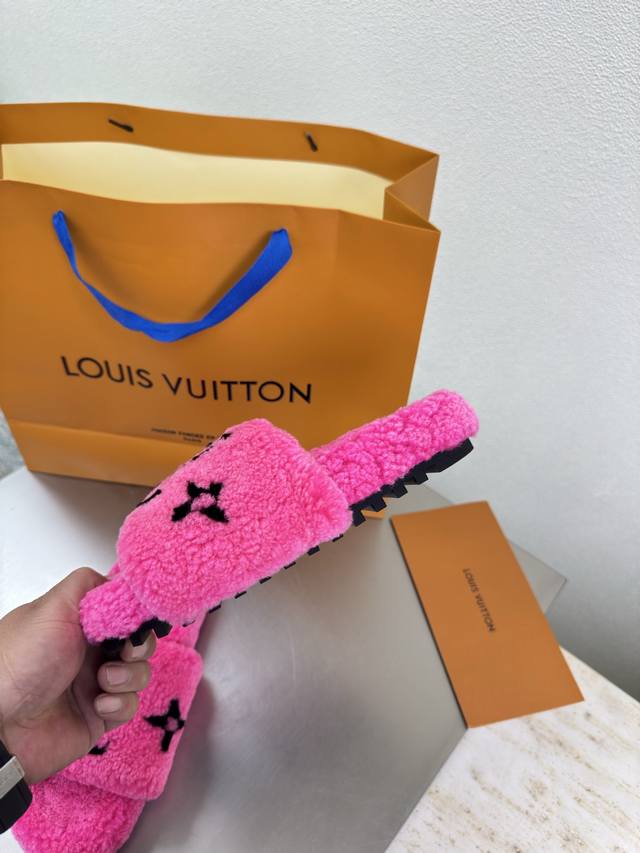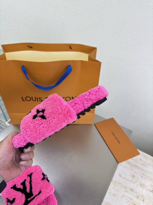 双色效果 拼色Logo 进口羊羔毛拖鞋 L驴超高性价比 包装 高品质 无瑕疵 5种配色 玫红色羊羔毛 钻石手工缝制 Logo Lv 打造 使得 Lv 仍能为创作