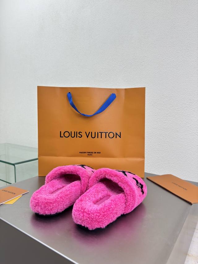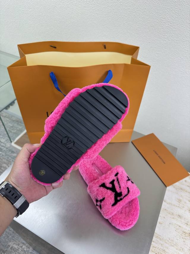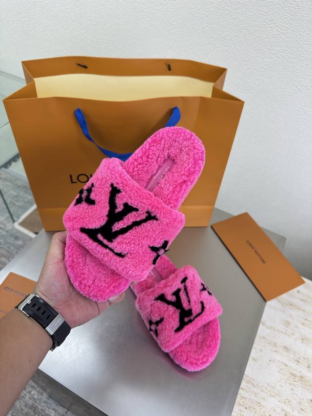 / 双色效果 拼色Logo 进口羊羔毛拖鞋 L驴超高性价比 包装 高品质 无瑕疵 5种配色 玫红色羊羔毛 钻石手工缝制 Logo Lv 打造 使得 Lv 仍能为创作