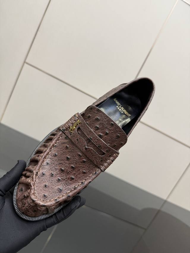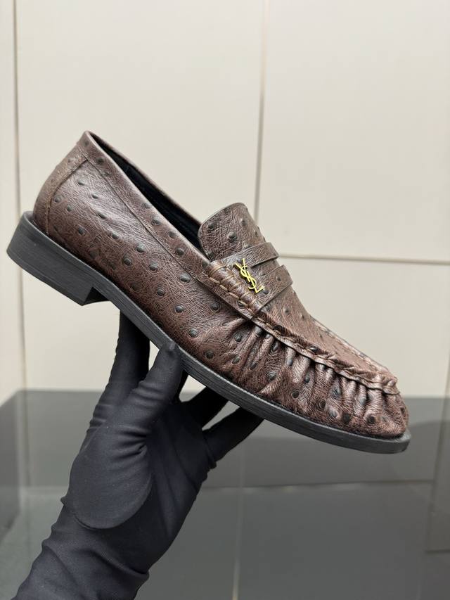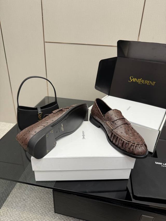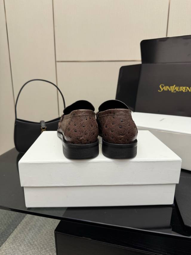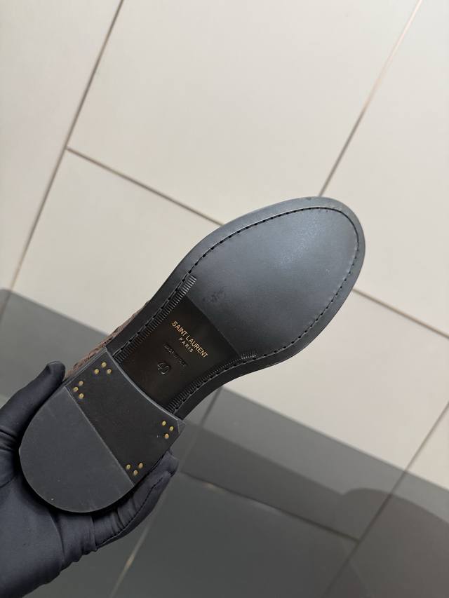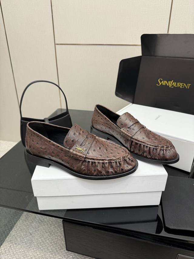 女码: 男码:350 Saint Lauren*Ysl圣罗兰25Ss新品 Ysl小Logo乐福鞋单鞋 标志性的小Logo是这双鞋的灵魂所在 以低调而精致的姿态呈现于鞋身之上。 不同于张扬的大标识 它安静却醒目 用简洁线条勾勒出Ysl独有的时尚Dna 在不经意间透露出品牌的深厚底蕴 鞋头的经典杏仁形设计 巧妙修饰脚型 在视觉上拉长足部线条 彰显优雅与秀气 。 无论是搭配简约阔腿裤 还是俏皮小短裙 都能轻松驾驭 展现不同风格魅力 成为造型中的点睛之笔。 面料采用原版定制皮料 内里垫脚均为羊皮 意大利进口真皮大