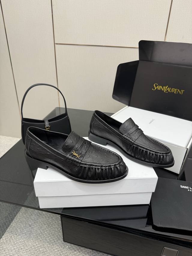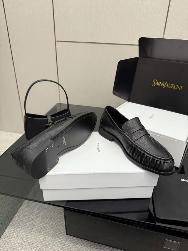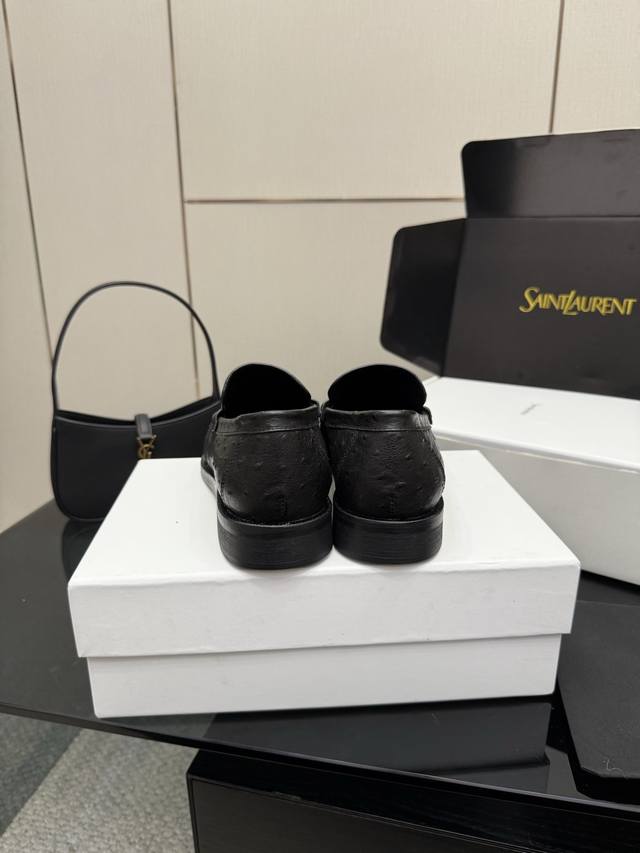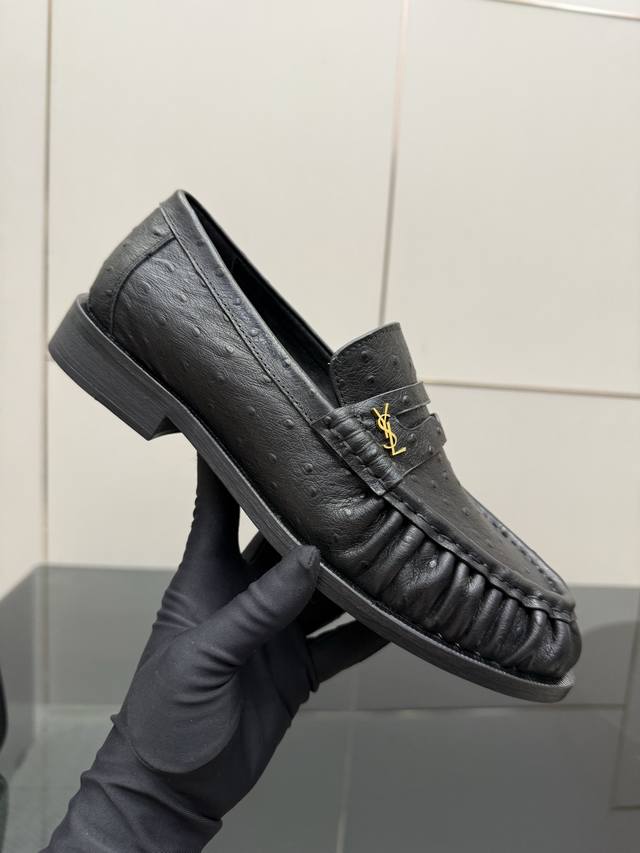 女码: 男码:350 Saint Lauren*Ysl圣罗兰25Ss新品 Ysl小Logo乐福鞋单鞋 标志性的小Logo是这双鞋的灵魂所在 以低调而精致的姿态呈现于鞋身之上。 不同于张扬的大标识 它安静却醒目 用简洁线条勾勒出Ysl独有的时尚Dna 在不经意间透露出品牌的深厚底蕴 鞋头的经典杏仁形设计 巧妙修饰脚型 在视觉上拉长足部线条 彰显优雅与秀气 。 无论是搭配简约阔腿裤 还是俏皮小短裙 都能轻松驾驭 展现不同风格魅力 成为造型中的点睛之笔。 面料采用原版定制皮料 内里垫脚均为羊皮 意大利进口真皮大