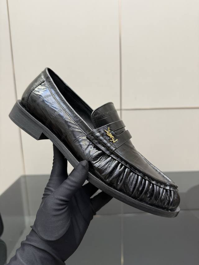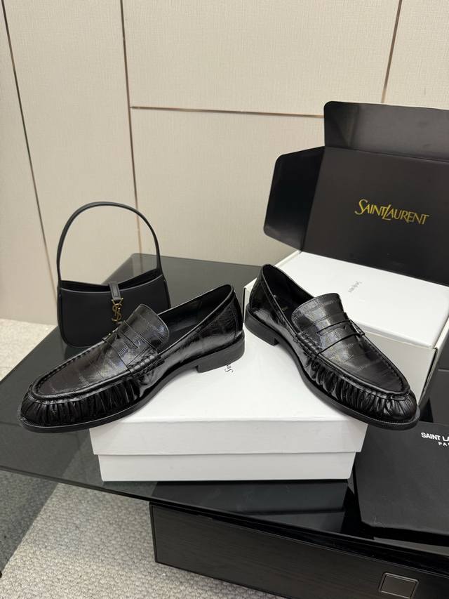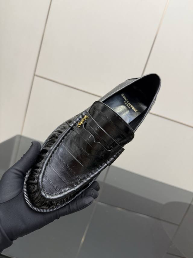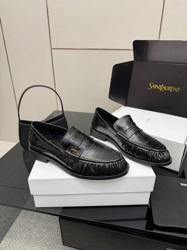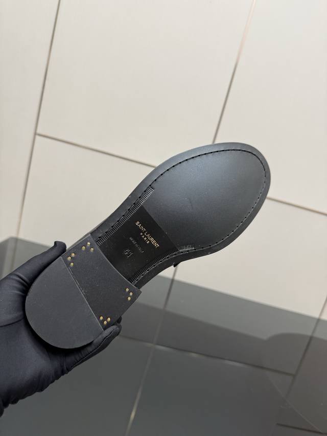 女码: 男码:350 Saint Lauren*Ysl圣罗兰25Ss新品 Ysl小Logo乐福鞋单鞋 标志性的小Logo是这双鞋的灵魂所在 以低调而精致的姿态呈现于鞋身之上。 不同于张扬的大标识 它安静却醒目 用简洁线条勾勒出Ysl独有的时尚Dna 在不经意间透露出品牌的深厚底蕴 鞋头的经典杏仁形设计 巧妙修饰脚型 在视觉上拉长足部线条 彰显优雅与秀气 。 无论是搭配简约阔腿裤 还是俏皮小短裙 都能轻松驾驭 展现不同风格魅力 成为造型中的点睛之笔。 面料采用原版定制皮料 内里垫脚均为羊皮 意大利进口真皮大