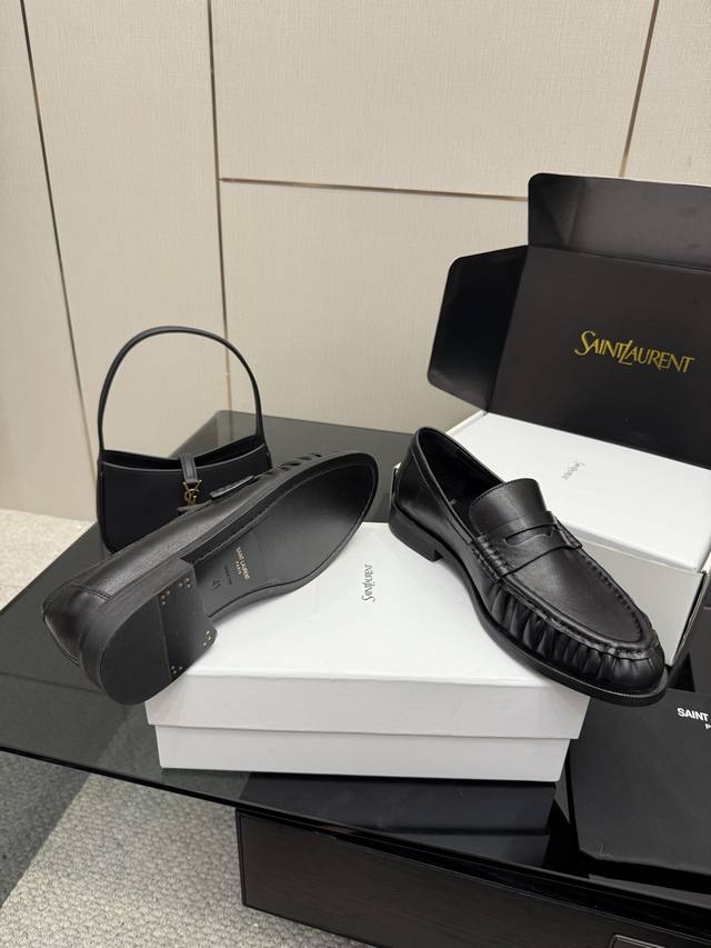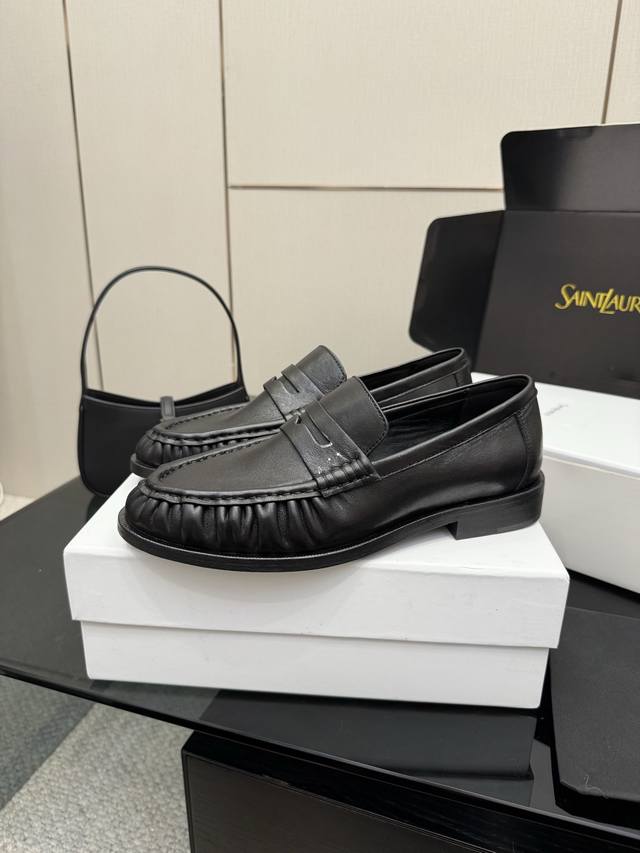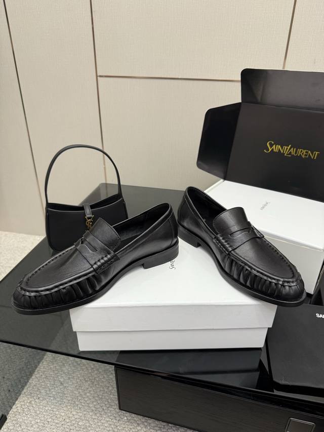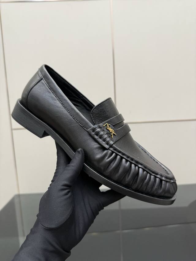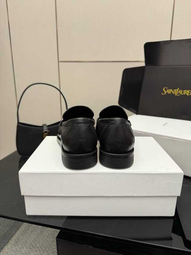 女码: 男码:350 Saint Lauren*Ysl圣罗兰25Ss新品 Ysl小Logo乐福鞋单鞋 标志性的小Logo是这双鞋的灵魂所在 以低调而精致的姿态呈现于鞋身之上。 不同于张扬的大标识 它安静却醒目 用简洁线条勾勒出Ysl独有的时尚Dna 在不经意间透露出品牌的深厚底蕴 鞋头的经典杏仁形设计 巧妙修饰脚型 在视觉上拉长足部线条 彰显优雅与秀气 。 无论是搭配简约阔腿裤 还是俏皮小短裙 都能轻松驾驭 展现不同风格魅力 成为造型中的点睛之笔。 面料采用原版定制皮料 内里垫脚均为羊皮 意大利进口真皮大