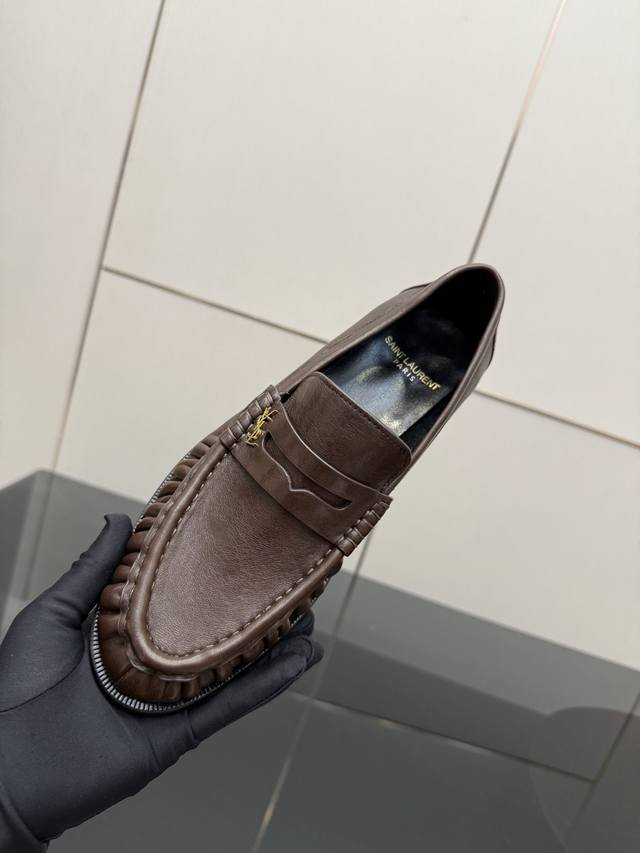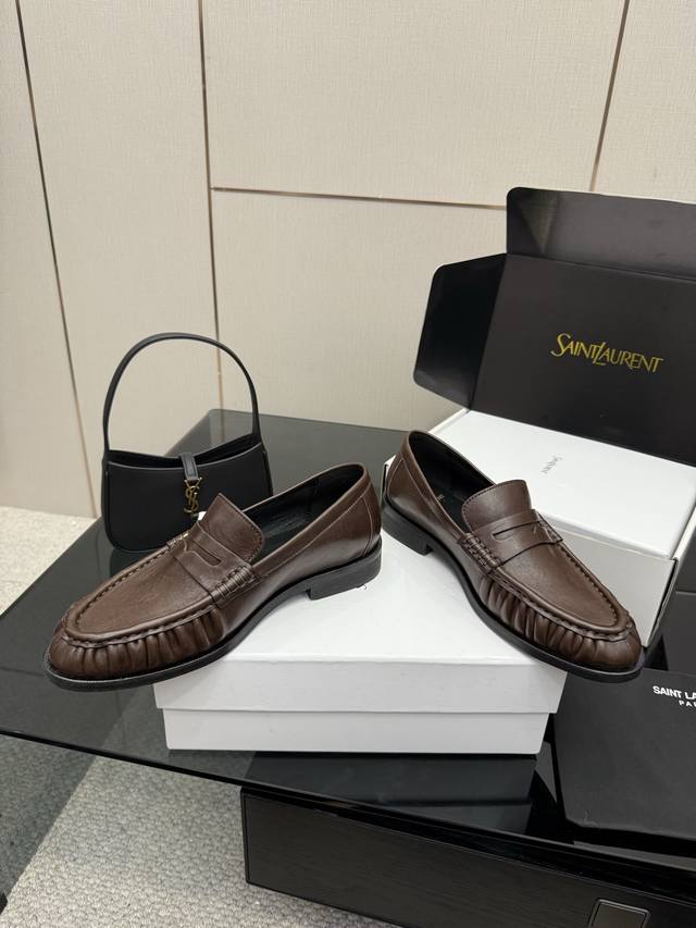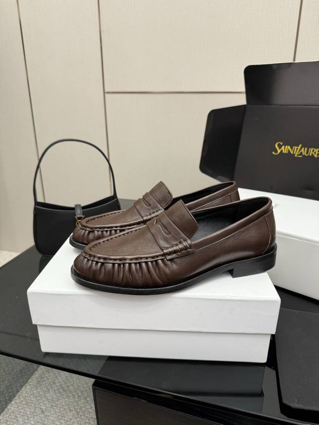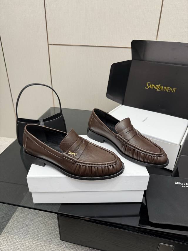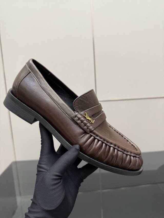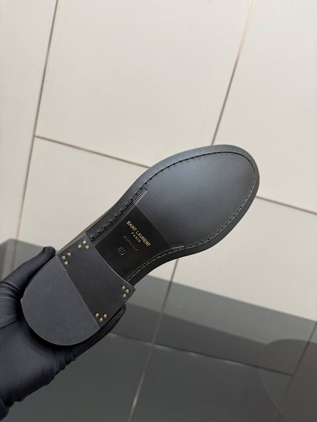 女码: 男码:350 Saint Lauren*Ysl圣罗兰25Ss新品 Ysl小Logo乐福鞋单鞋 标志性的小Logo是这双鞋的灵魂所在 以低调而精致的姿态呈现于鞋身之上。 不同于张扬的大标识 它安静却醒目 用简洁线条勾勒出Ysl独有的时尚Dna 在不经意间透露出品牌的深厚底蕴 鞋头的经典杏仁形设计 巧妙修饰脚型 在视觉上拉长足部线条 彰显优雅与秀气 。 无论是搭配简约阔腿裤 还是俏皮小短裙 都能轻松驾驭 展现不同风格魅力 成为造型中的点睛之笔。 面料采用原版定制皮料 内里垫脚均为羊皮 意大利进口真皮大