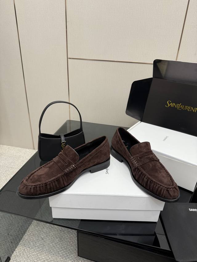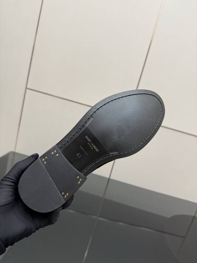女码: 男码:350 Saint Lauren*Ysl圣罗兰25Ss新品 Ysl小Logo乐福鞋单鞋 标志性的小Logo是这双鞋的灵魂所在 以低调而精致的姿态呈现于鞋身之上。 不同于张扬的大标识 它安静却醒目 用简洁线条勾勒出Ysl独有的时尚Dna 在不经意间透露出品牌的深厚底蕴 鞋头的经典杏仁形设计 巧妙修饰脚型 在视觉上拉长足部线条 彰显优雅与秀气 。 无论是搭配简约阔腿裤 还是俏皮小短裙 都能轻松驾驭 展现不同风格魅力 成为造型中的点睛之笔。 面料采用原版定制皮料 内里垫脚均为羊皮 意大利进口真皮大