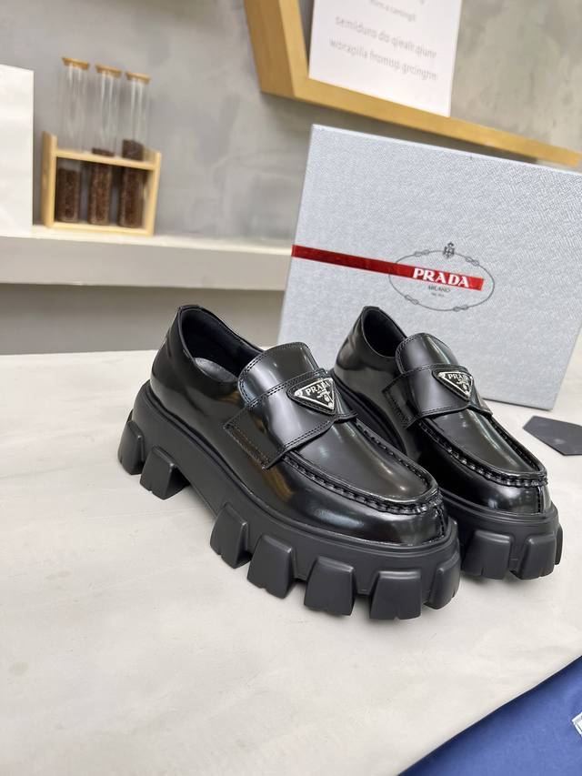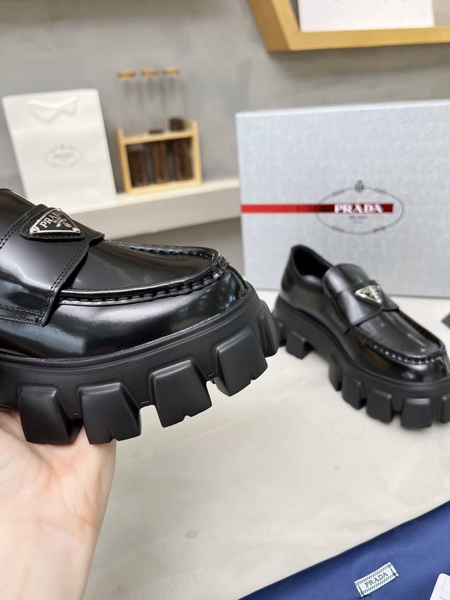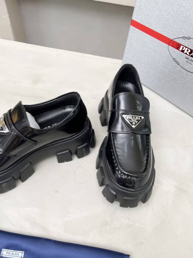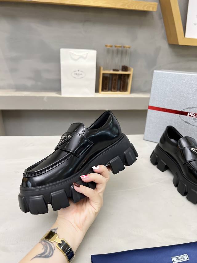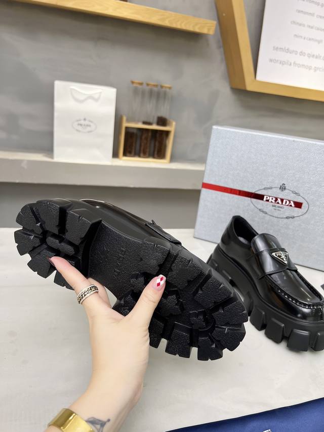 / 女码,35-41.出厂价P ,春秋新款黑色开边朱漆皮厚底休闲小皮鞋,刘雯众多网红上脚,Prad这款松糕厚底鞋今年非常爆,穿上 增高 休闲两不失误,清爽的表现足以