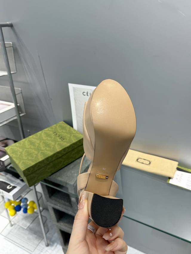 工厂P价 G家顶级代购 Gucci 夏季新款 恨天高高跟水台凉拖鞋经典马街链条扣 上脚非常完美,优雅大方并且性感! 面料:牛皮 内里 垫脚:进口羊皮里 鞋跟:1