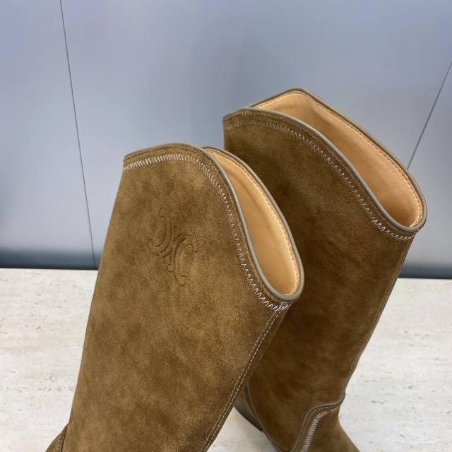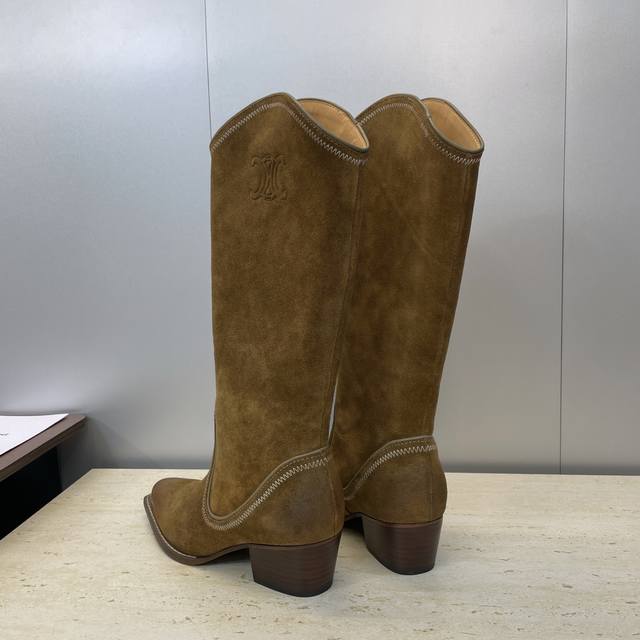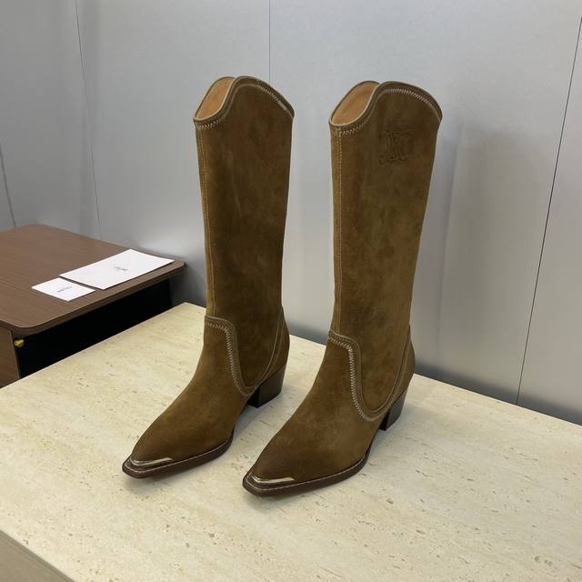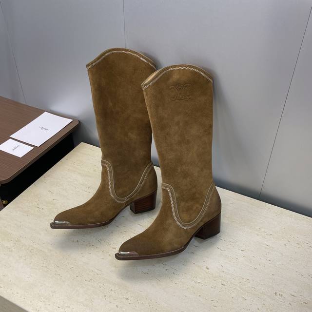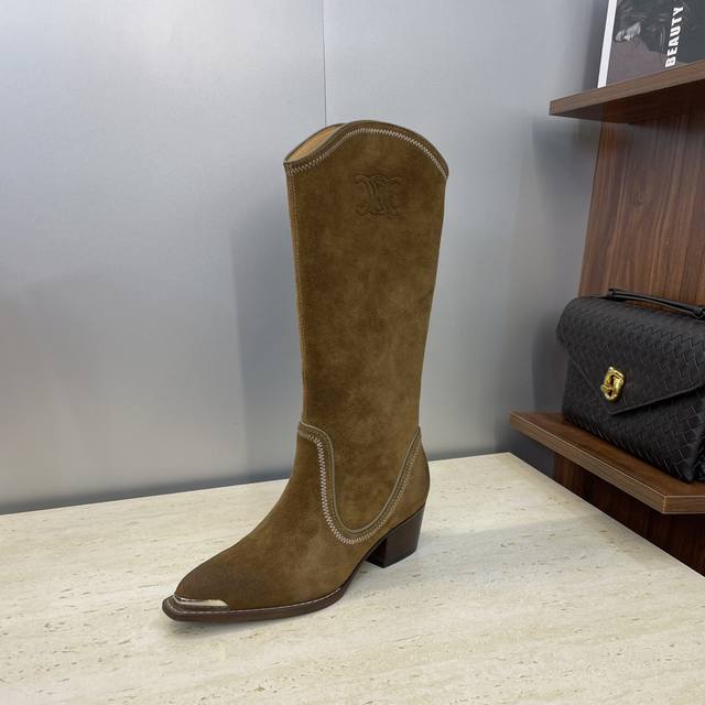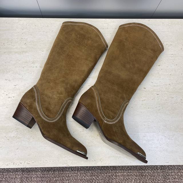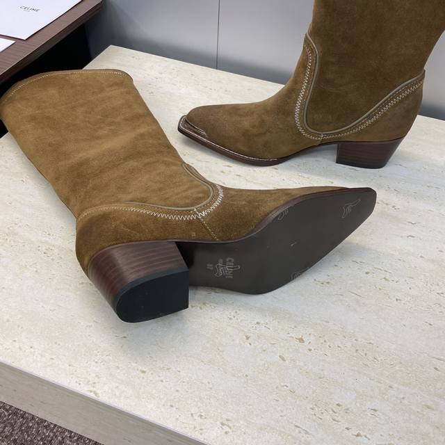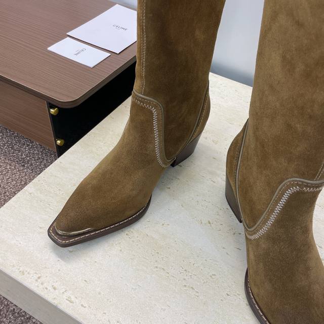 工厂P价P皮面 羊猄皮 Celine 2025秋冬新款朋克风格铁头机车女长靴 瑟琳字母Logo五金扣粗跟尖头高筒及膝骑士靴 材质:鞋面定制进口小牛皮 进口羊猄皮+水染牛皮内里+意大利真皮大底 跟高:4.5Cm Size:女码35-41 40.41定制不退换