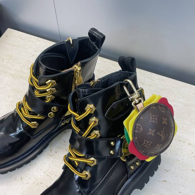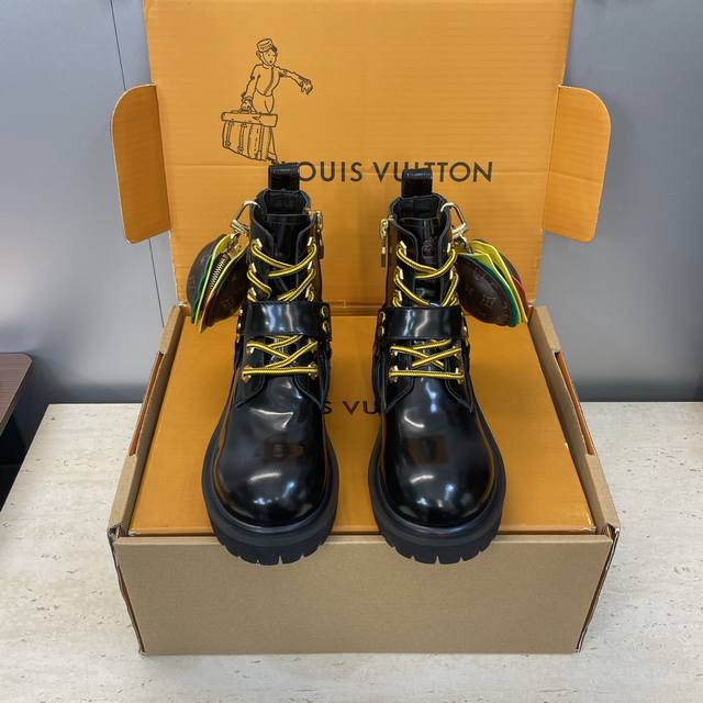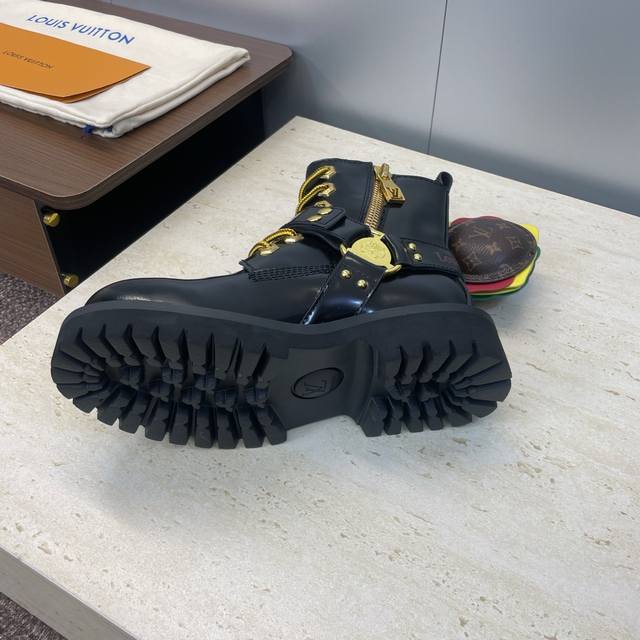 工厂P价P 不配包 Louis Vuitton*X Timberland联名合作款2025秋冬新款情侣款游牧风格系带机车短靴 Lv字母Logo五金扣汉堡包装饰厚底拼色一脚蹬骑士靴 材质:鞋面进口丝绸牛皮 开边珠牛皮+水染羊皮内里+原版开模大底 Size:女码35-41 40.41定制不退换 男码39-44 45定制不退换