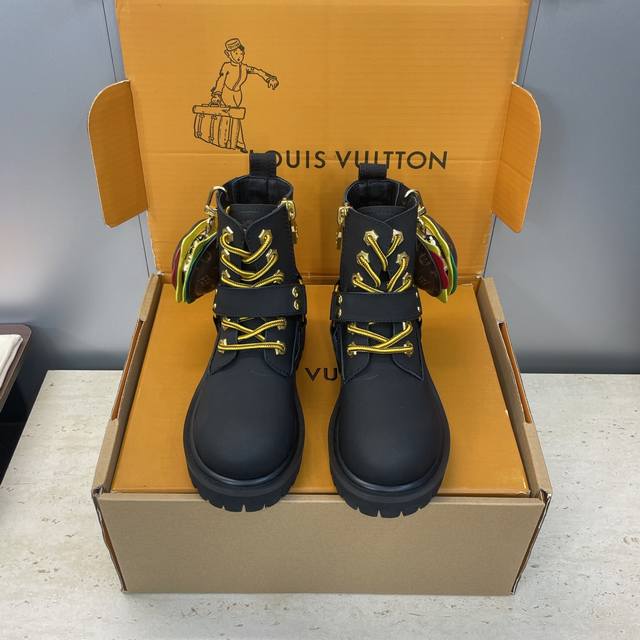 工厂P价P 不配包 Louis Vuitton*X Timberland联名合作款2025秋冬新款情侣款游牧风格系带机车短靴 Lv字母Logo五金扣汉堡包装饰厚底拼色一脚蹬骑士靴 材质:鞋面进口丝绸牛皮 开边珠牛皮+水染羊皮内里+原版开模大底 Size:女码35-41 40.41定制不退换 男码39-44 45定制不退换