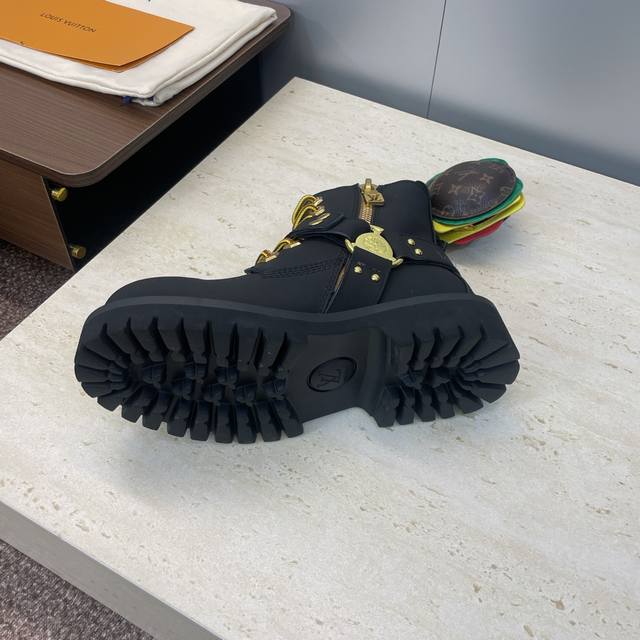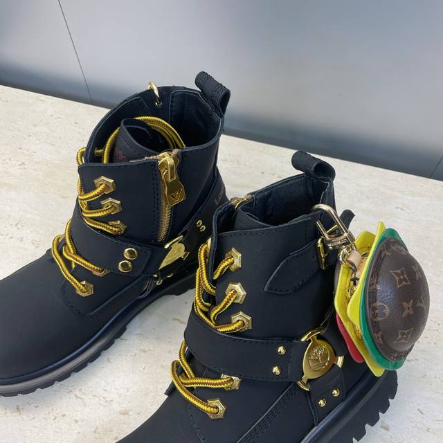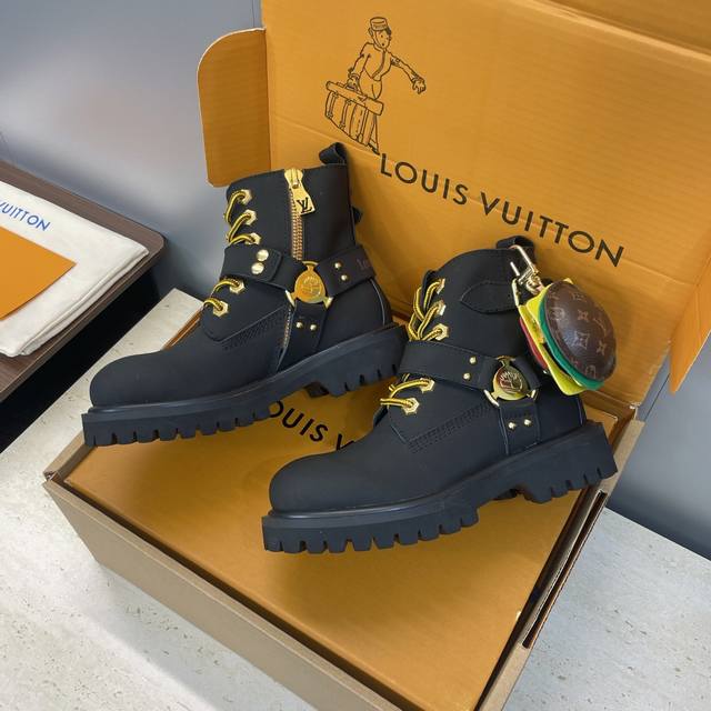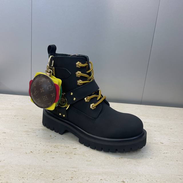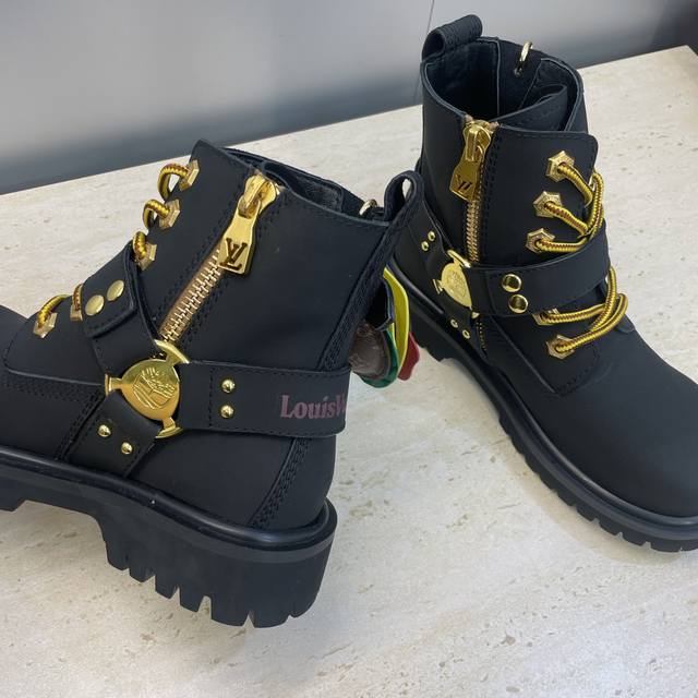 工厂P价P 不配包 Louis Vuitton*X Timberland联名合作款2025秋冬新款情侣款游牧风格系带机车短靴 Lv字母Logo五金扣汉堡包装饰厚