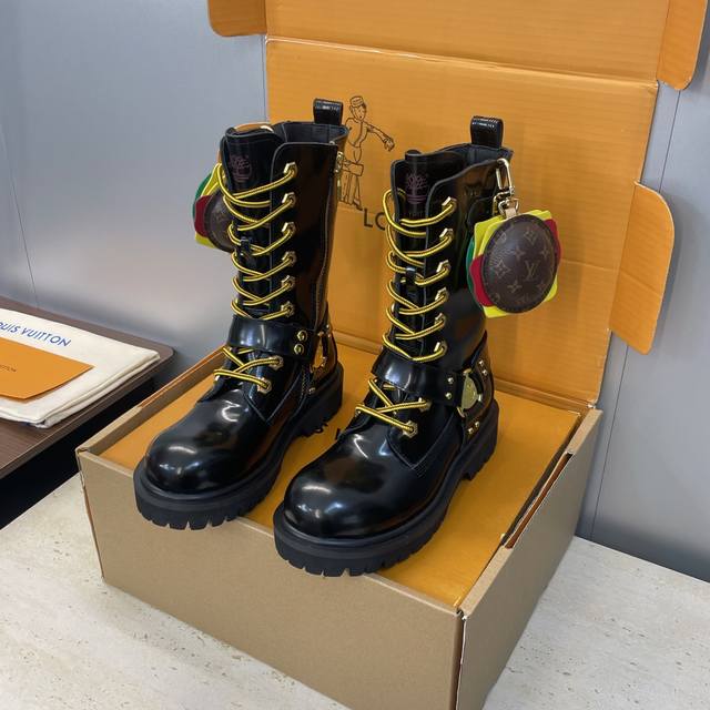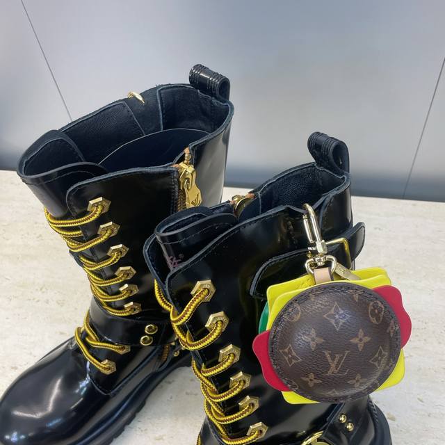 工厂P价P 不配包 Louis Vuitton*X Timberland联名合作款2025秋冬新款情侣款游牧风格系带机车短靴 Lv字母Logo五金扣汉堡包装饰厚底拼色一脚蹬骑士靴 材质:鞋面进口丝绸牛皮 开边珠牛皮+水染羊皮内里+原版开模大底 Size:女码35-41 40.41定制不退换 男码39-44 45定制不退换