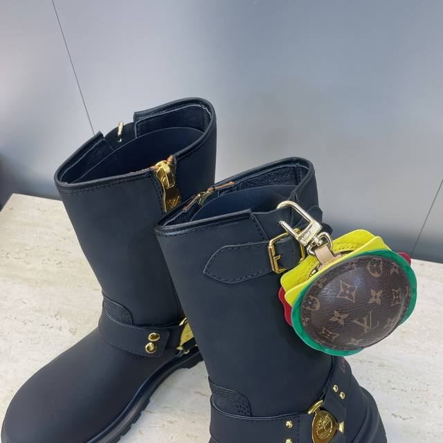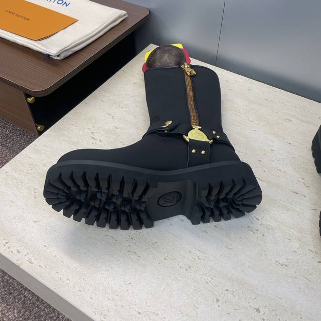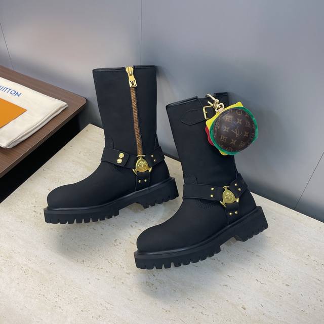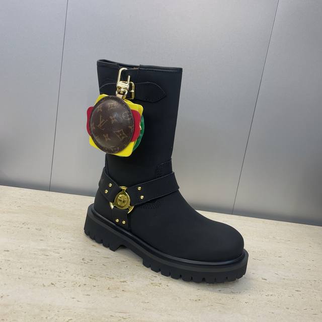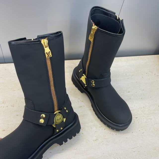 工厂P价P 不配包 Louis Vuitton*X Timberland联名合作款2025秋冬新款情侣款游牧风格系带机车短靴 Lv字母Logo五金扣汉堡包装饰厚底拼色一脚蹬骑士靴 材质:鞋面进口丝绸牛皮 开边珠牛皮+水染羊皮内里+原版开模大底 Size:女码35-41 40.41定制不退换 男码39-44 45定制不退换