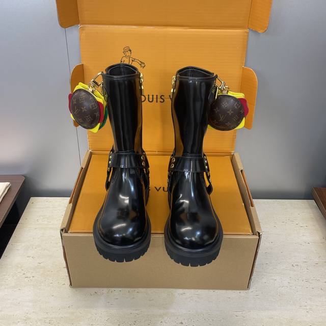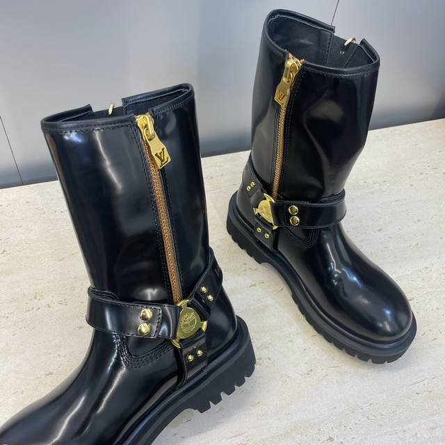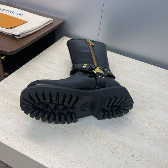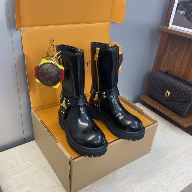 工厂P价P 不配包 Louis Vuitton*X Timberland联名合作款2025秋冬新款情侣款游牧风格系带机车短靴 Lv字母Logo五金扣汉堡包装饰厚底拼色一脚蹬骑士靴 材质:鞋面进口丝绸牛皮 开边珠牛皮+水染羊皮内里+原版开模大底 Size:女码35-41 40.41定制不退换 男码39-44 45定制不退换