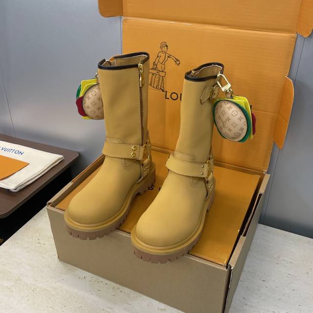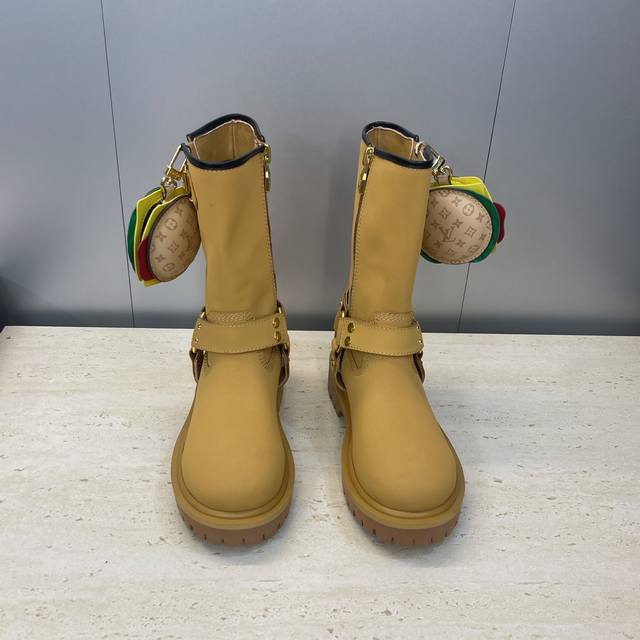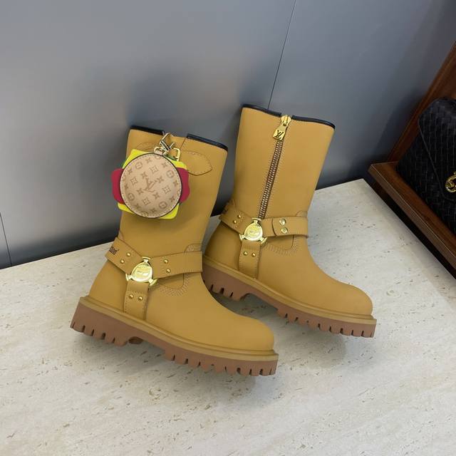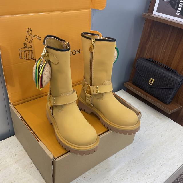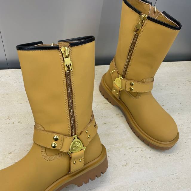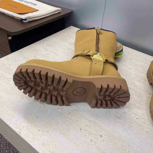工厂P价P 不配包 Louis Vuitton*X Timberland联名合作款2025秋冬新款情侣款游牧风格系带机车短靴 Lv字母Logo五金扣汉堡包装饰厚底拼色一脚蹬骑士靴 材质:鞋面进口丝绸牛皮 开边珠牛皮+水染羊皮内里+原版开模大底 Size:女码35-41 40.41定制不退换 男码39-44 45定制不退换