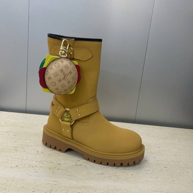 / 工厂P价P 不配包 Louis Vuitton*X Timberland联名合作款2025秋冬新款情侣款游牧风格系带机车短靴 Lv字母Logo五金扣汉堡包装饰厚