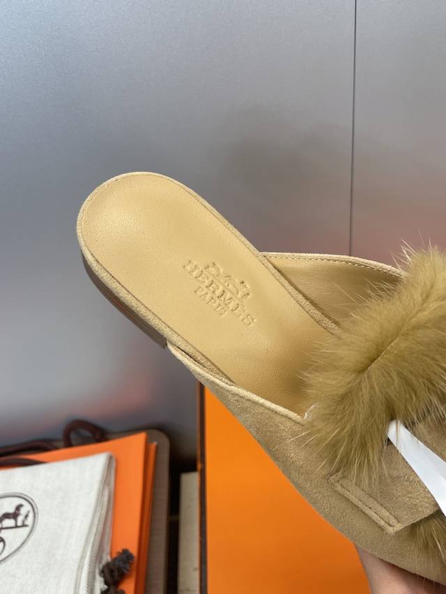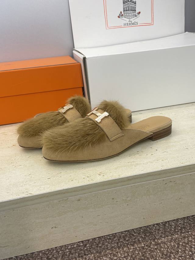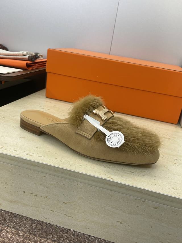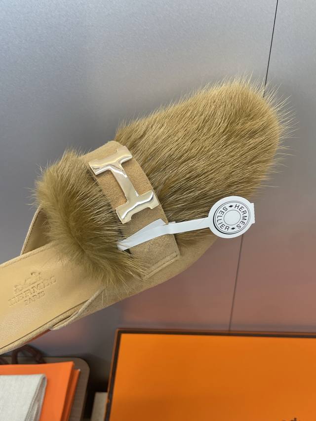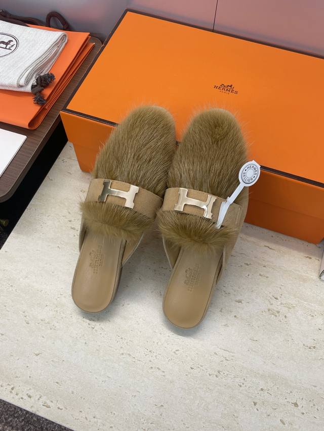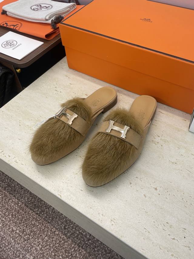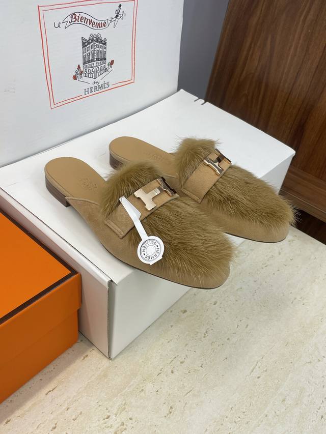 / 工厂P价P 莞货 代购级 Hermes 爱马仕 2025秋冬新款Royal 拼色低跟羊羔毛女鞋 H家字母Logo五金扣平底圆头防寒保暖穆勒拖鞋 材质:进口小牛皮