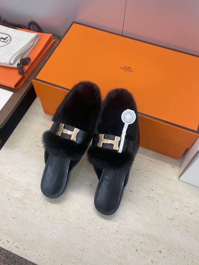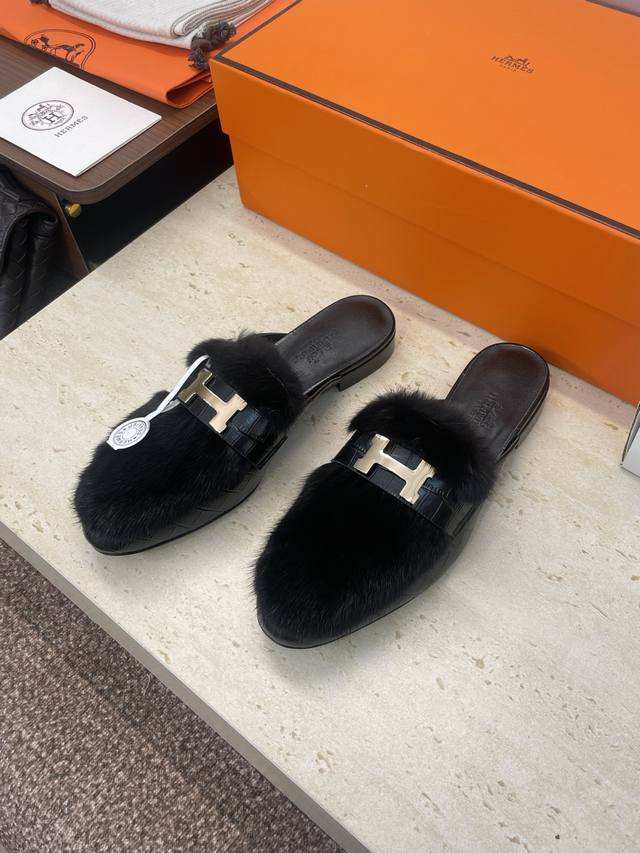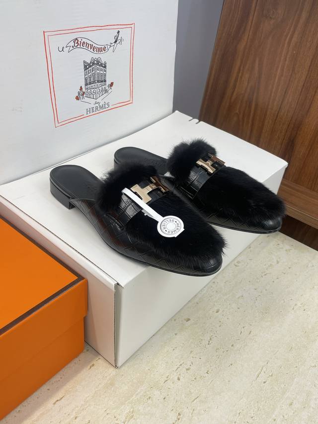 工厂P价P 莞货 代购级 Hermes 爱马仕 2025秋冬新款Royal 拼色低跟羊羔毛女鞋 H家字母Logo五金扣平底圆头防寒保暖穆勒拖鞋 材质:进口小牛皮 进口羊猄皮 进口羊羔毛+水染羊皮水里+意大利真皮大底 Size: 35-43 34.40.41.42.43定制不退换