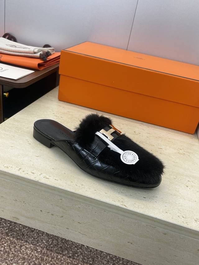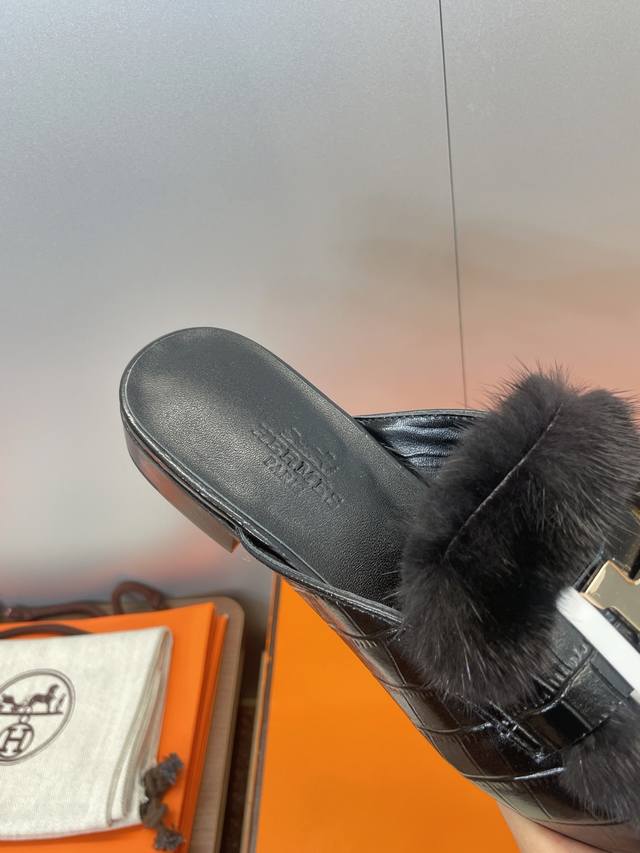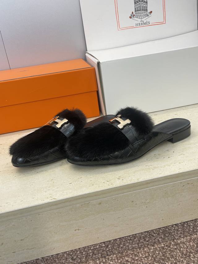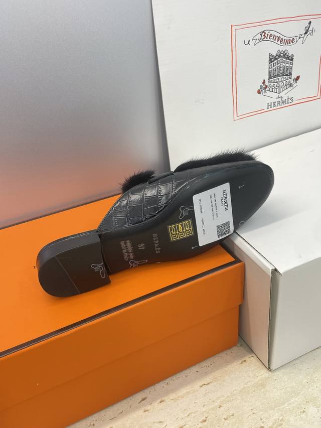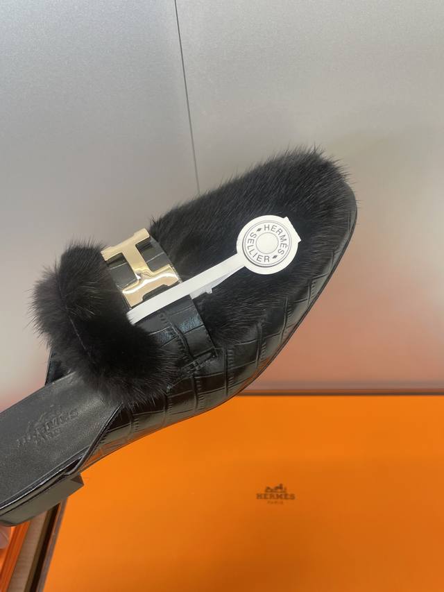 工厂P价P 莞货 代购级 Hermes 爱马仕 2025秋冬新款Royal 拼色低跟羊羔毛女鞋 H家字母Logo五金扣平底圆头防寒保暖穆勒拖鞋 材质:进口小牛皮
