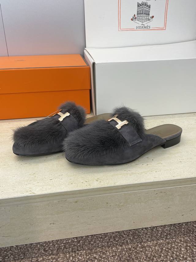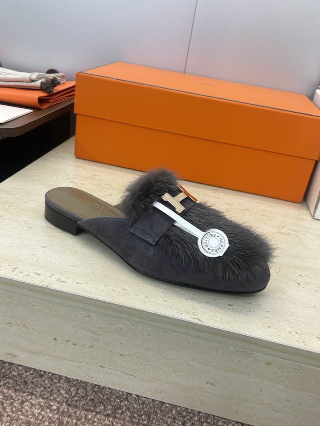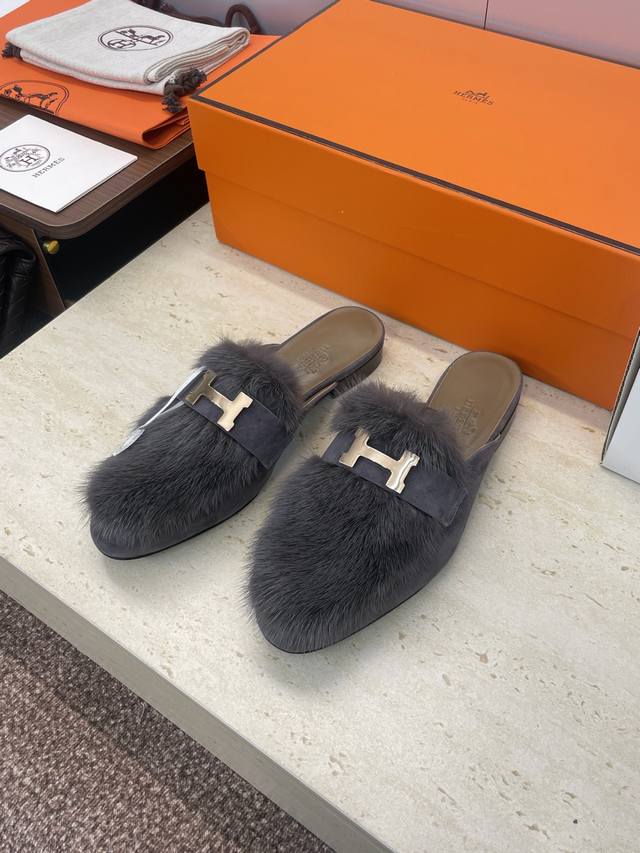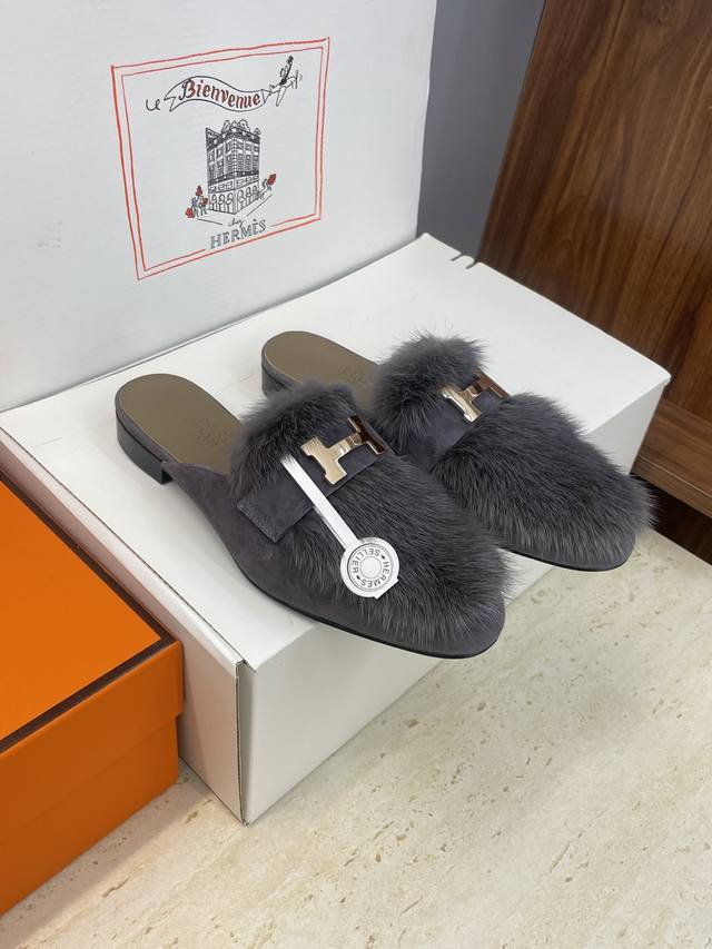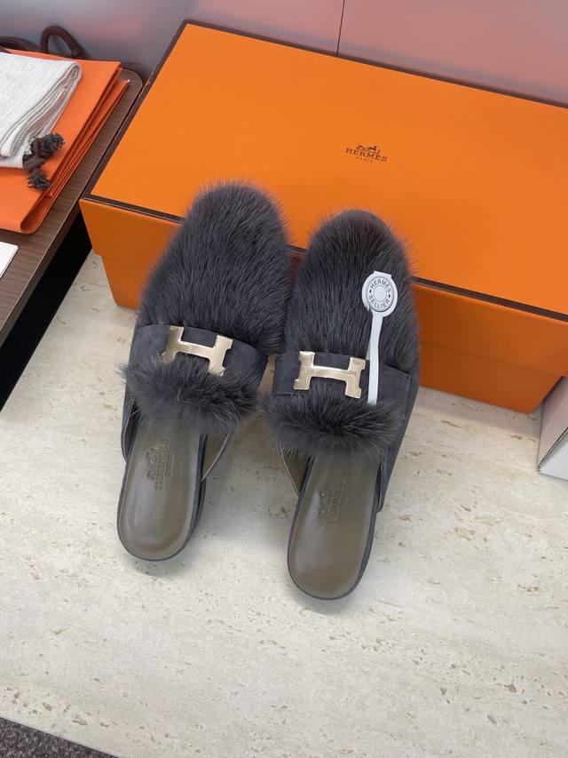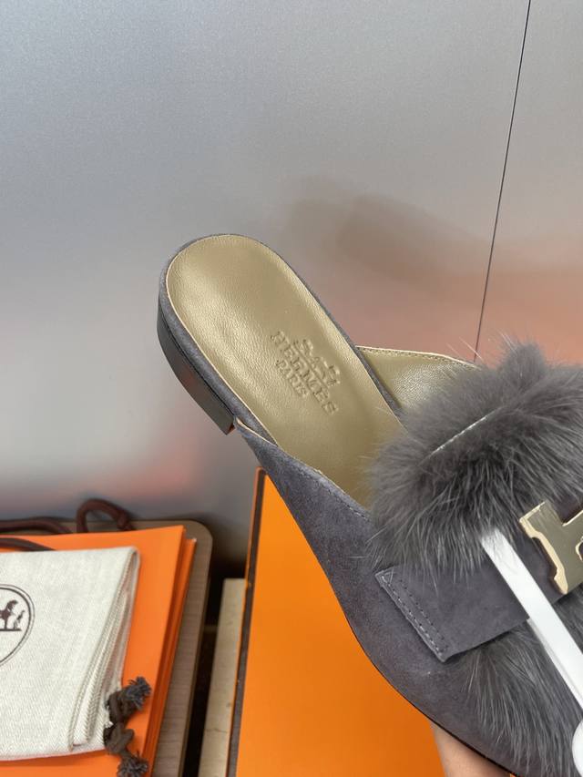 工厂P价P 莞货 代购级 Hermes 爱马仕 2025秋冬新款Royal 拼色低跟羊羔毛女鞋 H家字母Logo五金扣平底圆头防寒保暖穆勒拖鞋 材质:进口小牛皮 进口羊猄皮 进口羊羔毛+水染羊皮水里+意大利真皮大底 Size: 35-43 34.40.41.42.43定制不退换