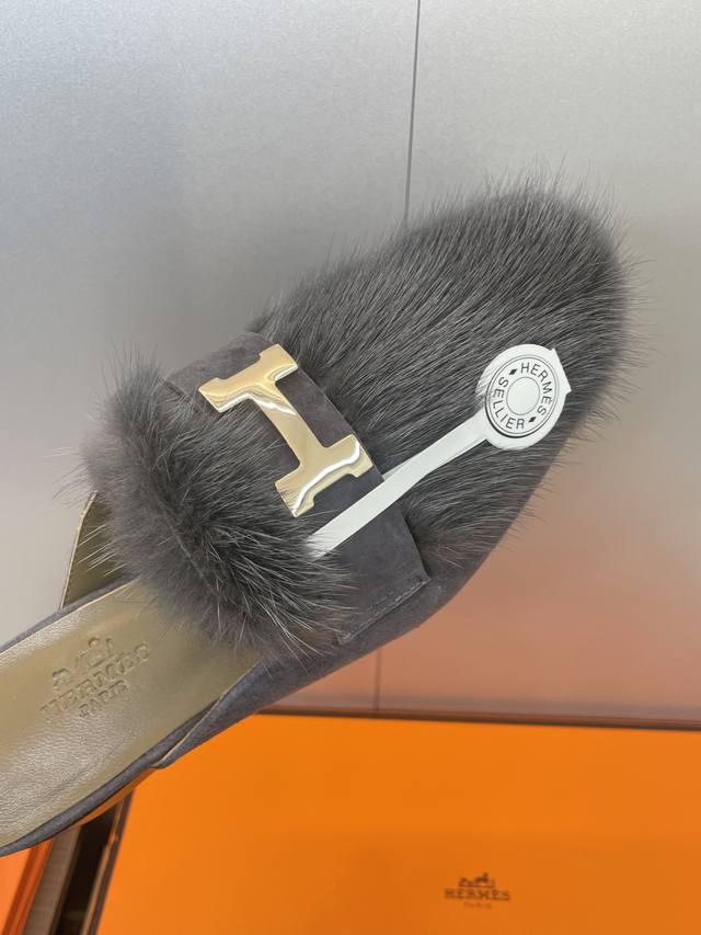 / 工厂P价P 莞货 代购级 Hermes 爱马仕 2025秋冬新款Royal 拼色低跟羊羔毛女鞋 H家字母Logo五金扣平底圆头防寒保暖穆勒拖鞋 材质:进口小牛皮