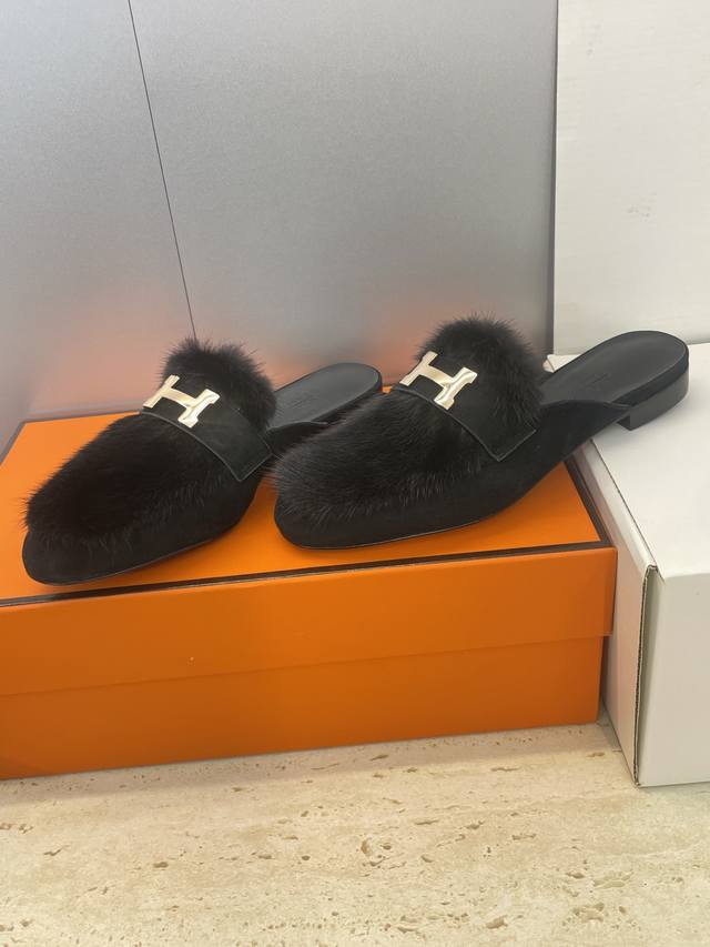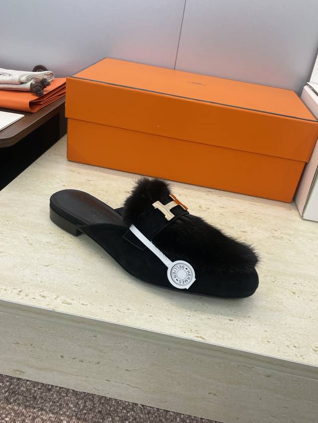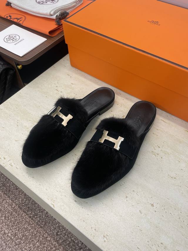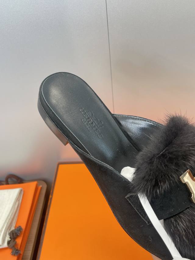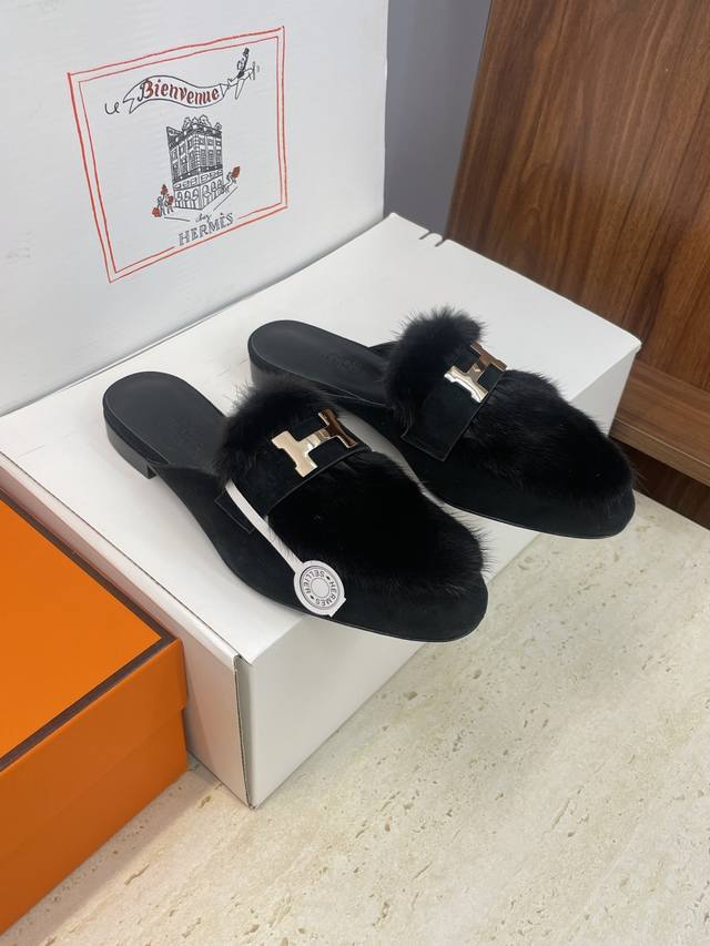 工厂P价P 莞货 代购级 Hermes 爱马仕 2025秋冬新款Royal 拼色低跟羊羔毛女鞋 H家字母Logo五金扣平底圆头防寒保暖穆勒拖鞋 材质:进口小牛皮