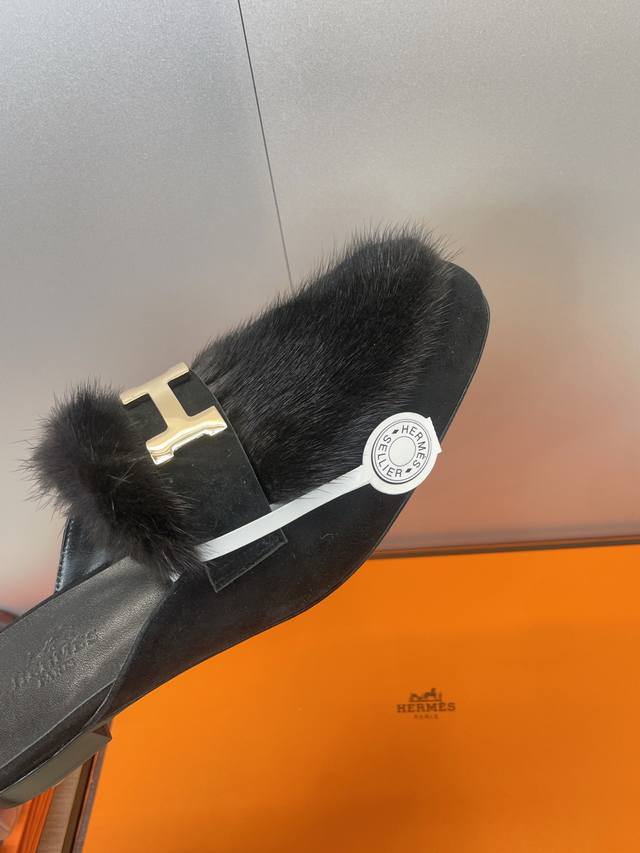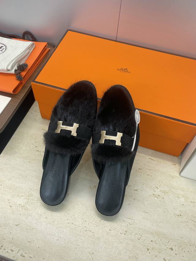 / 工厂P价P 莞货 代购级 Hermes 爱马仕 2025秋冬新款Royal 拼色低跟羊羔毛女鞋 H家字母Logo五金扣平底圆头防寒保暖穆勒拖鞋 材质:进口小牛皮