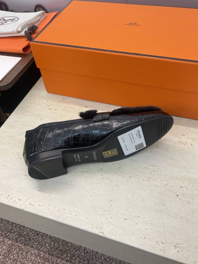 / 工厂P价P 莞货 代购级 Hermes 爱马仕 2025秋冬新款Royal 拼色低跟羊羔毛芭蕾舞女鞋 H家字母Logo五金扣平底圆头防寒保暖乐福鞋 材质:进口小