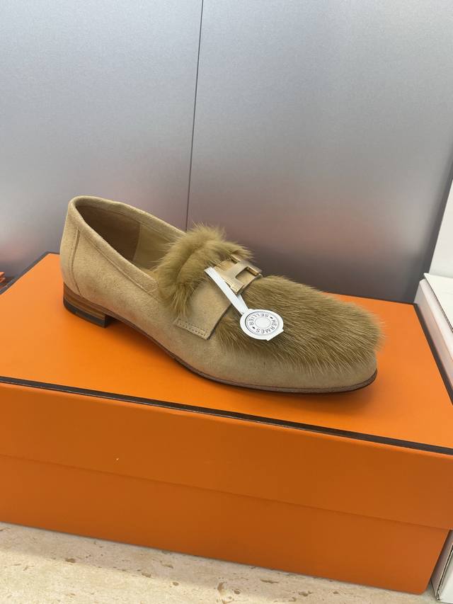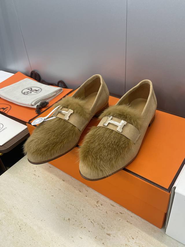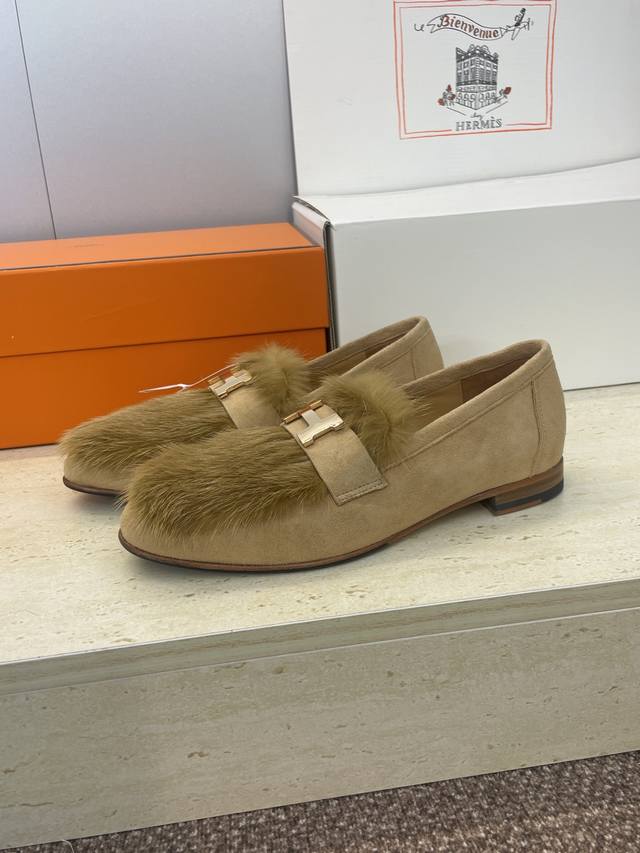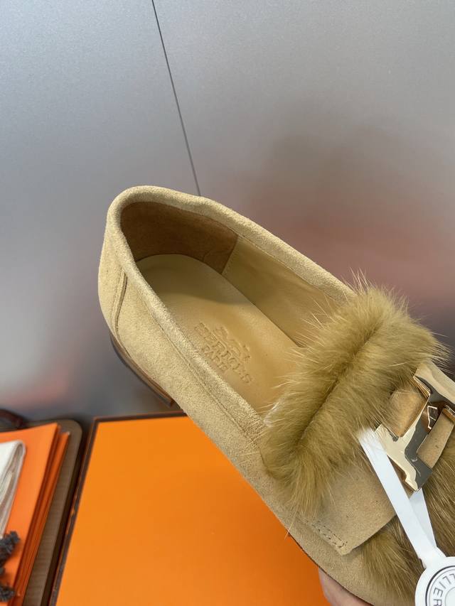 工厂P价P 莞货 代购级 Hermes 爱马仕 2025秋冬新款Royal 拼色低跟羊羔毛芭蕾舞女鞋 H家字母Logo五金扣平底圆头防寒保暖乐福鞋 材质:进口小牛皮 进口羊猄皮 进口羊羔毛+水染羊皮水里+意大利真皮大底 Size: 35-43 34.40.41.42.43定制不退换
