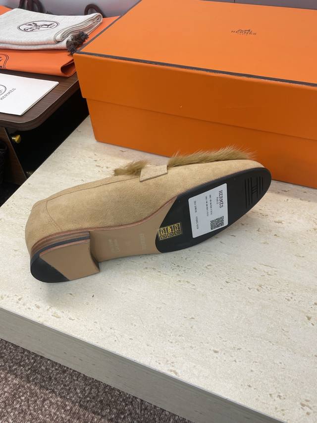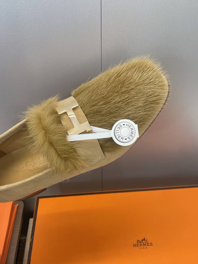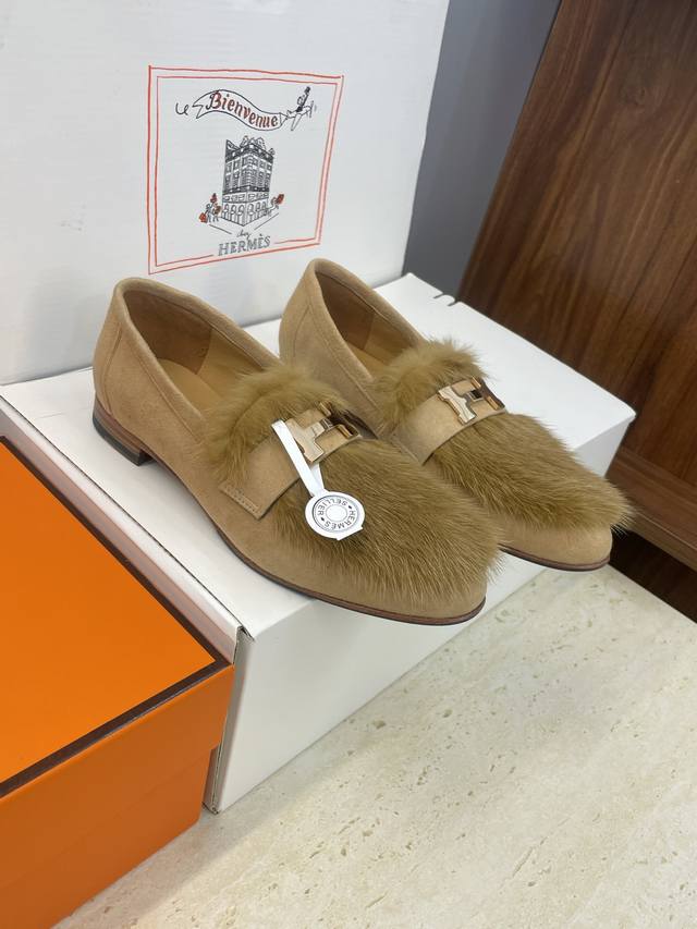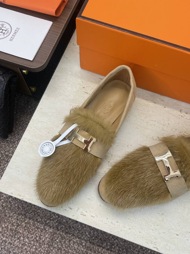 / 工厂P价P 莞货 代购级 Hermes 爱马仕 2025秋冬新款Royal 拼色低跟羊羔毛芭蕾舞女鞋 H家字母Logo五金扣平底圆头防寒保暖乐福鞋 材质:进口小