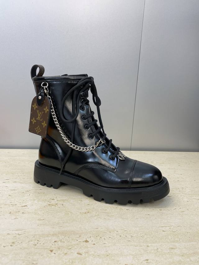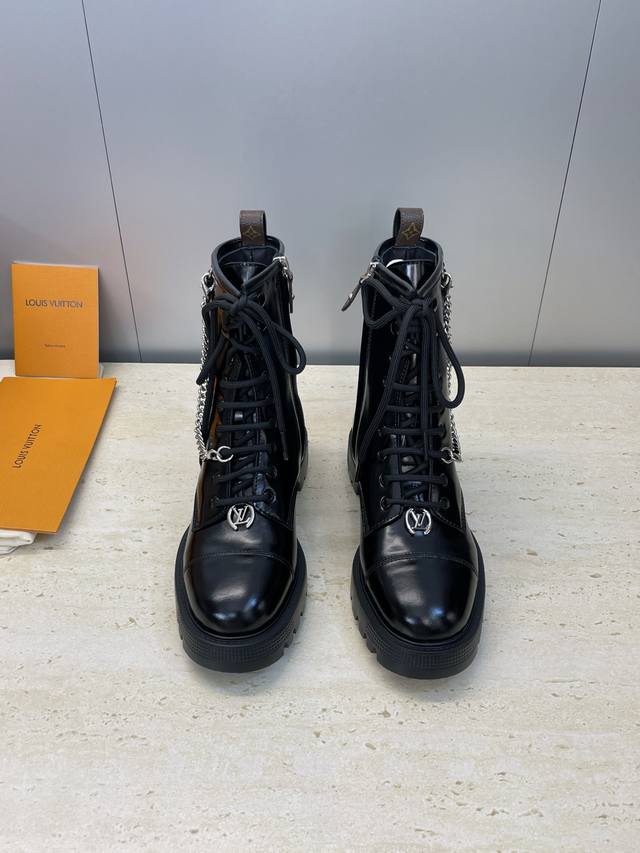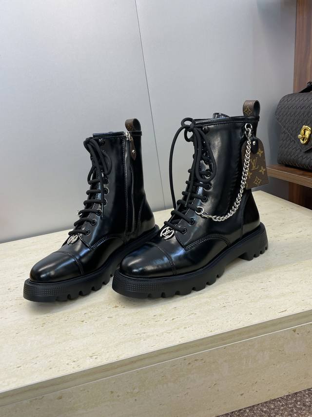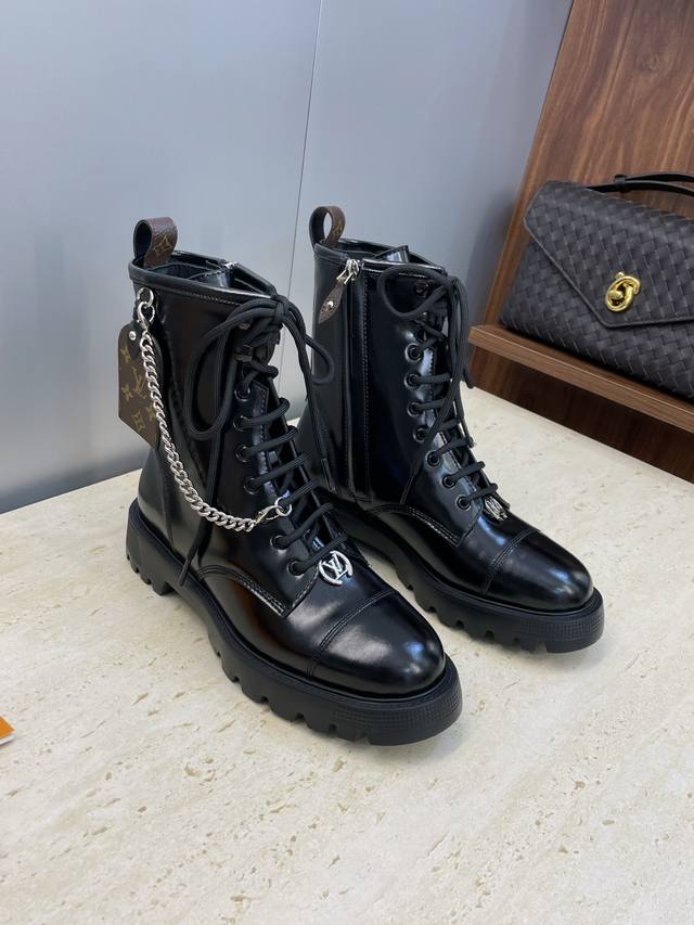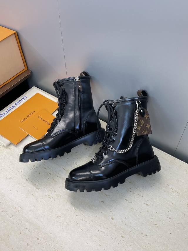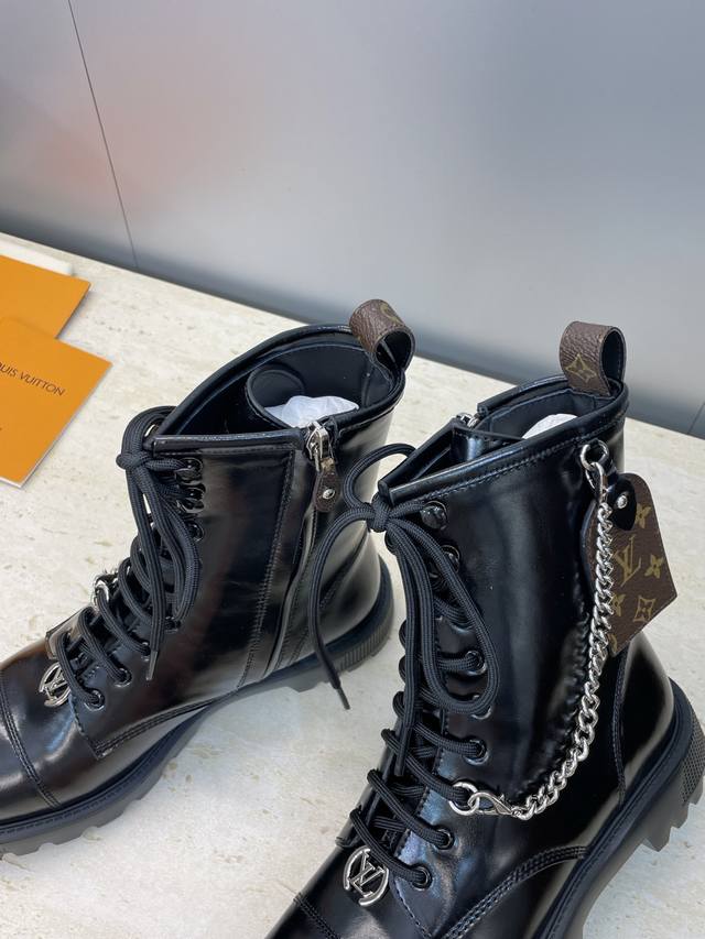 工厂P价P 莞货 代购级 Louis Vuitton* 2025秋冬新款朋克风格系带机车短靴 Lv字母Logo五金链条徽章扣厚底低跟拼色侧拉链骑士靴 材质:鞋面进口开边珠牛皮+水染牛皮内里+原版开模Ip大底 Size:女码35-41 40.41定制不退换