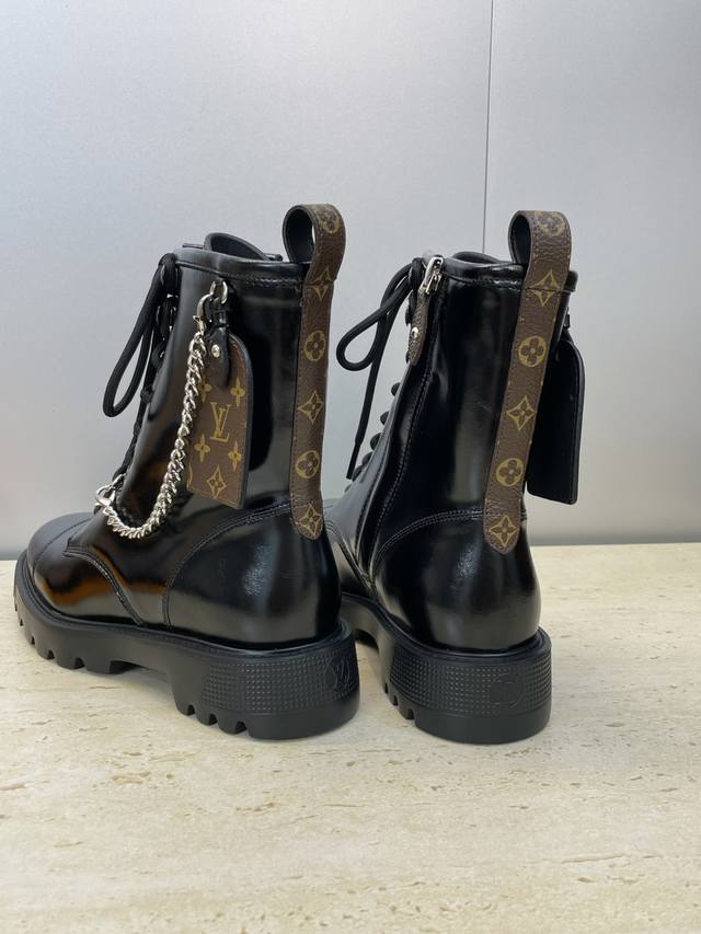 / 工厂P价P 莞货 代购级 Louis Vuitton* 2025秋冬新款朋克风格系带机车短靴 Lv字母Logo五金链条徽章扣厚底低跟拼色侧拉链骑士靴 材质:鞋面