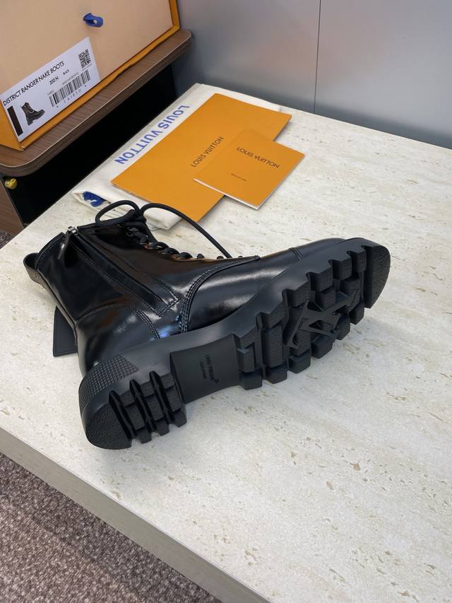 工厂P价P 莞货 代购级 Louis Vuitton* 2025秋冬新款朋克风格系带机车短靴 Lv字母Logo五金链条徽章扣厚底低跟拼色侧拉链骑士靴 材质:鞋面