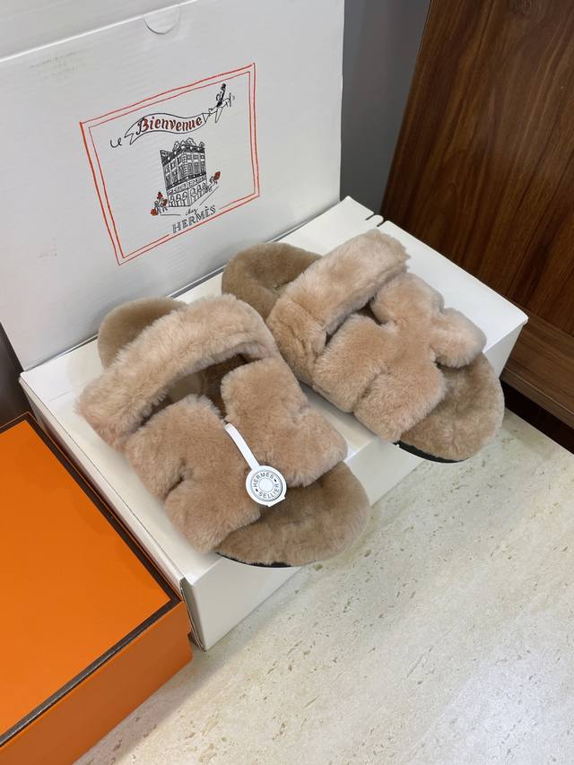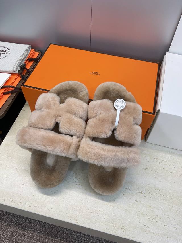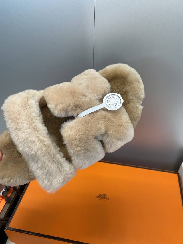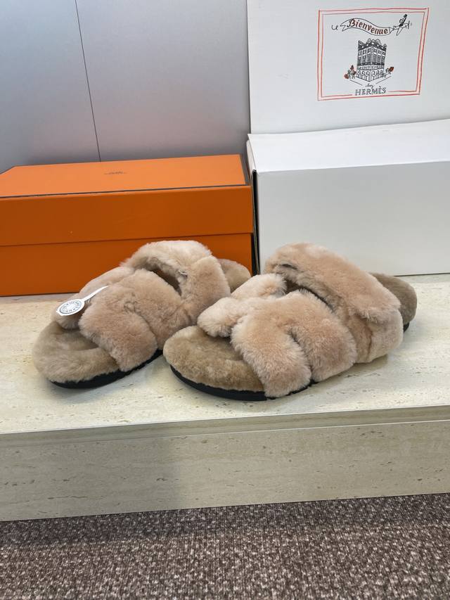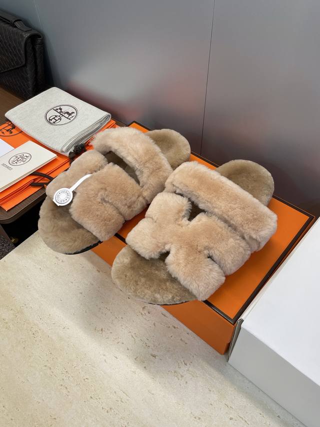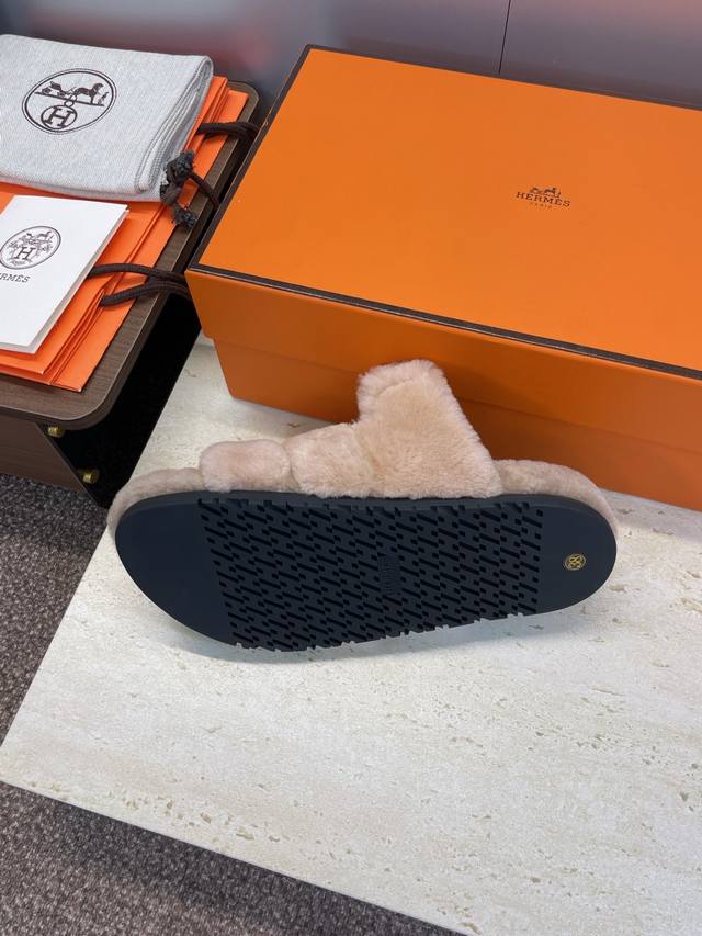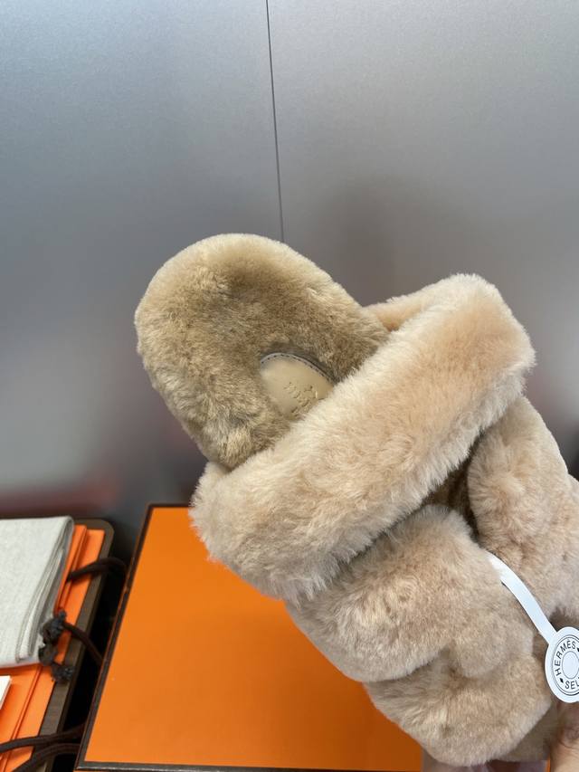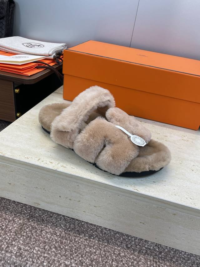 / 工厂P价P 莞货 顶级版 Hermers 爱马仕2025秋冬新色度假风拼色情侣款懒人毛毛鞋 H家经典平底圆头露趾保暖羊羔毛居家二舅拖鞋 材质:鞋面内里100%进
