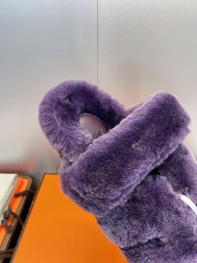 工厂P价P 莞货 顶级版 Hermers 爱马仕2025秋冬新色度假风拼色情侣款懒人毛毛鞋 H家经典平底圆头露趾保暖羊羔毛居家二舅拖鞋 材质:鞋面内里100%进