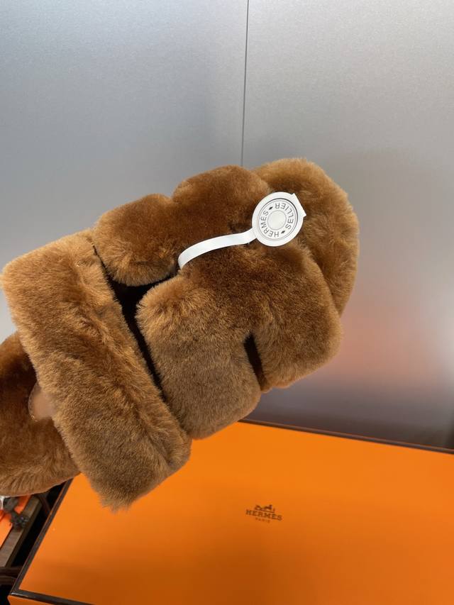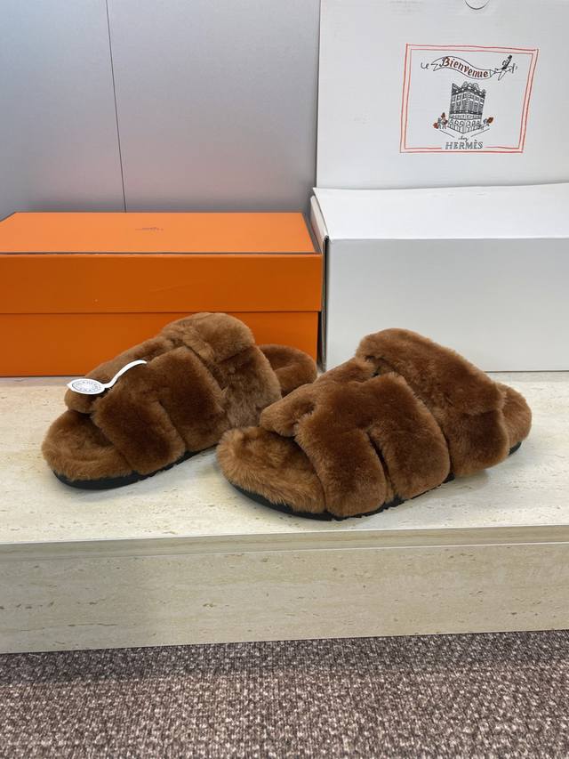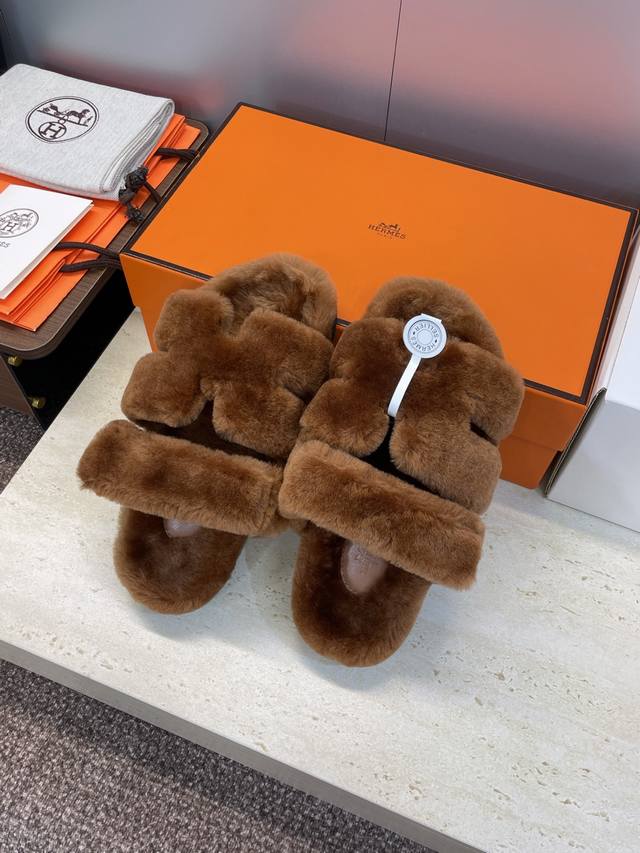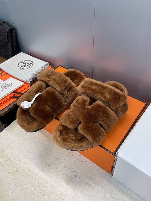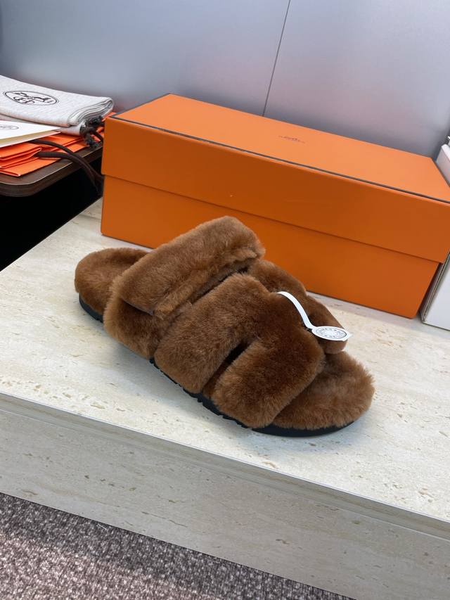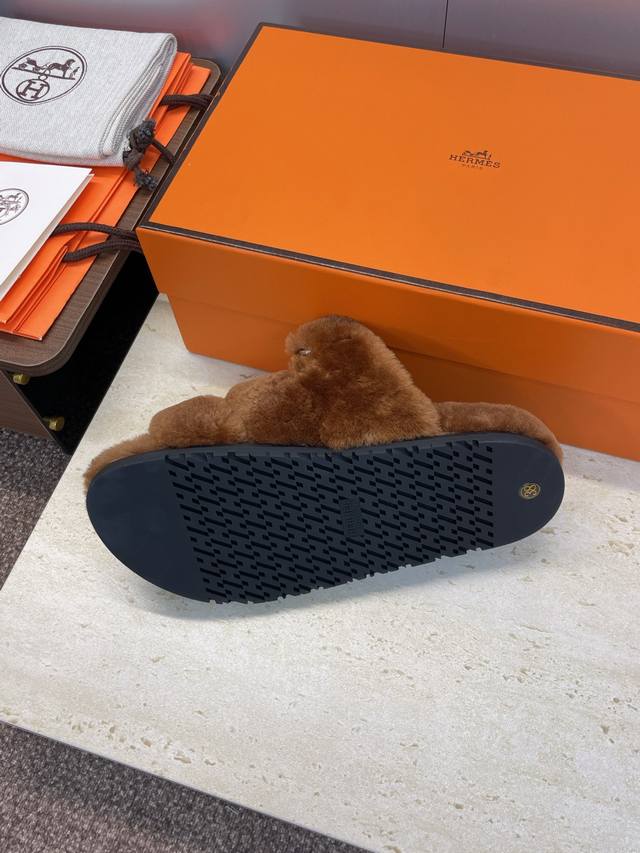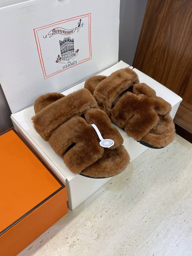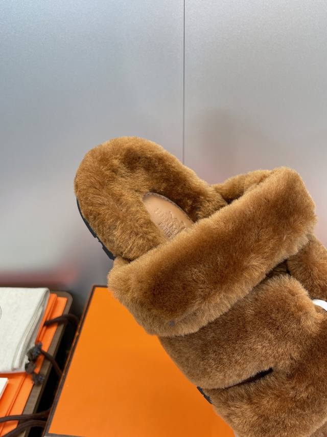 / 工厂P价P 莞货 顶级版 Hermers 爱马仕2025秋冬新色度假风拼色情侣款懒人毛毛鞋 H家经典平底圆头露趾保暖羊羔毛居家二舅拖鞋 材质:鞋面内里100%进