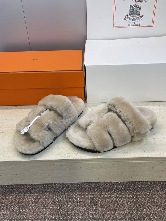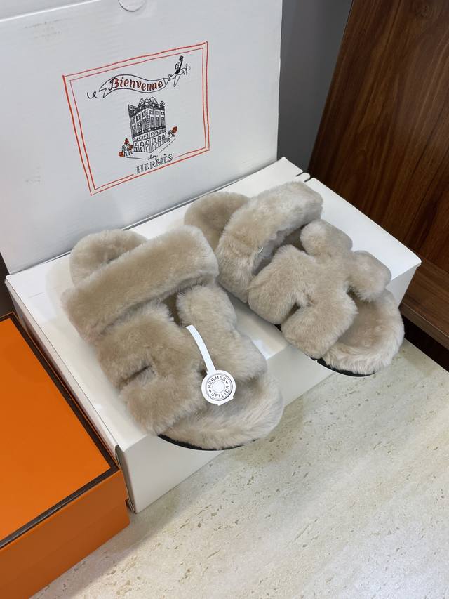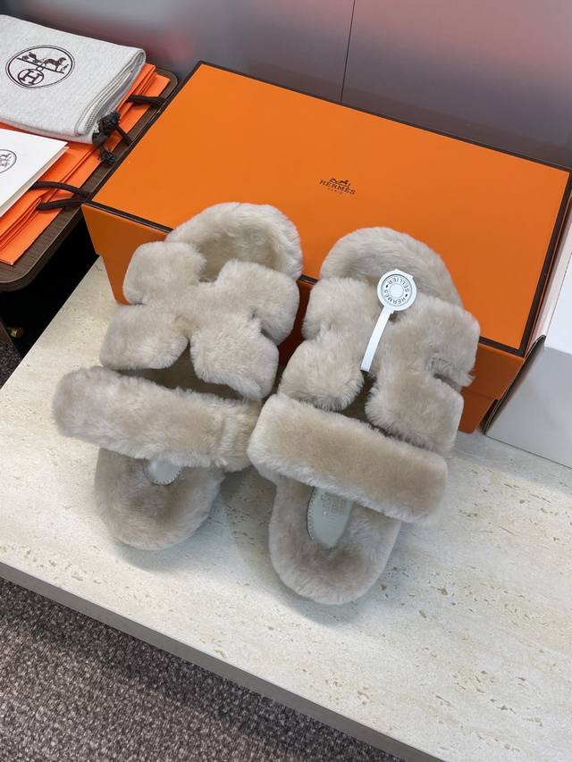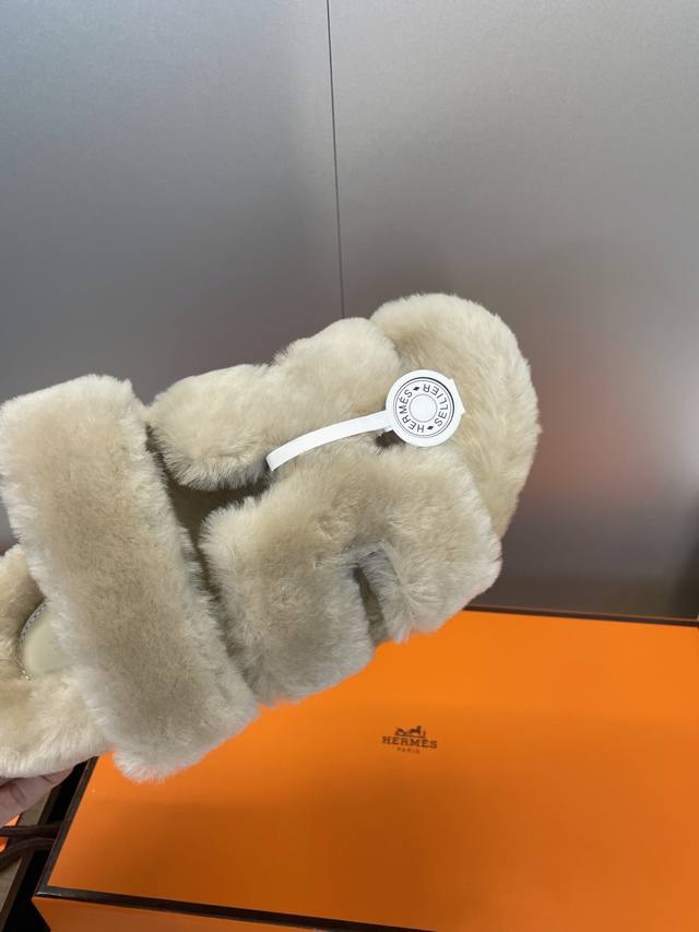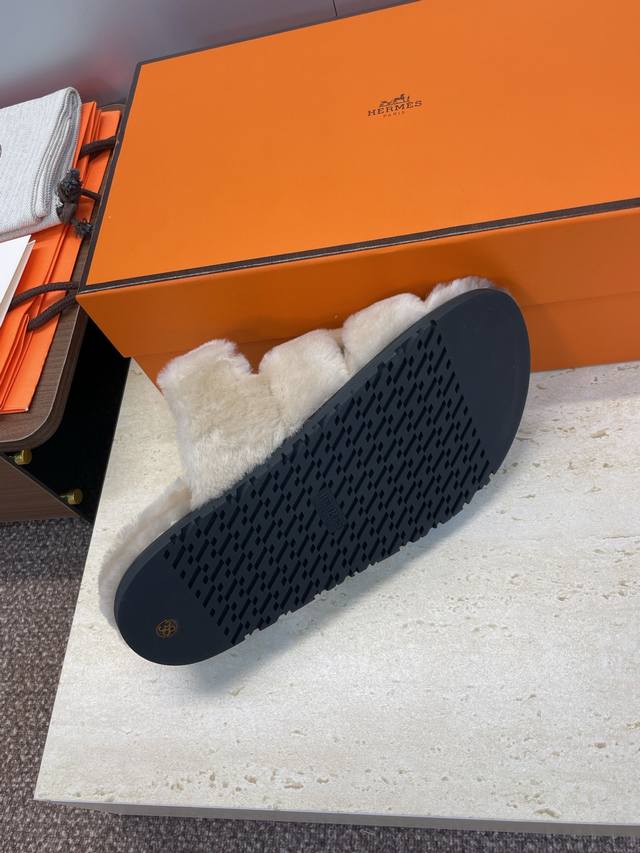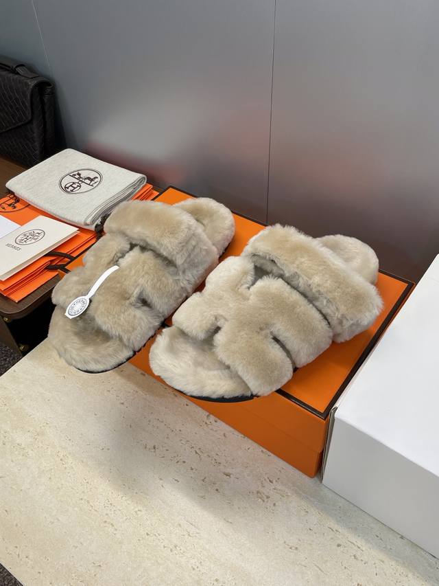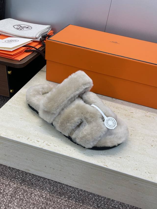 / 工厂P价P 莞货 顶级版 Hermers 爱马仕2025秋冬新色度假风拼色情侣款懒人毛毛鞋 H家经典平底圆头露趾保暖羊羔毛居家二舅拖鞋 材质:鞋面内里100%进