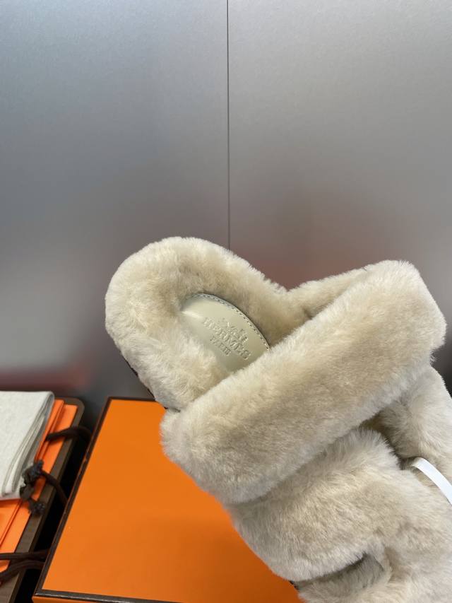 工厂P价P 莞货 顶级版 Hermers 爱马仕2025秋冬新色度假风拼色情侣款懒人毛毛鞋 H家经典平底圆头露趾保暖羊羔毛居家二舅拖鞋 材质:鞋面内里100%进