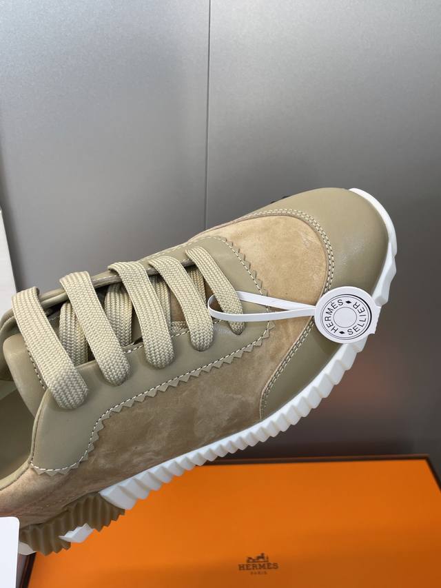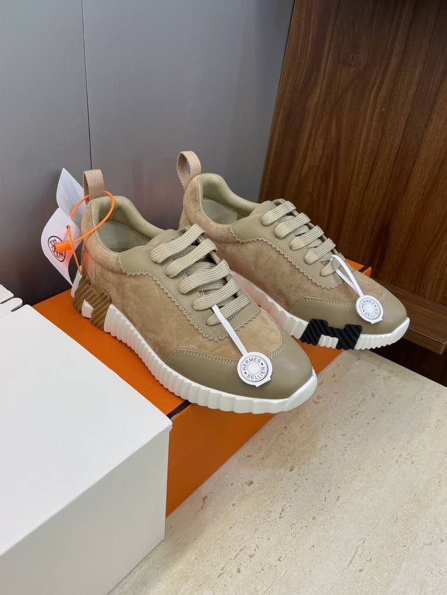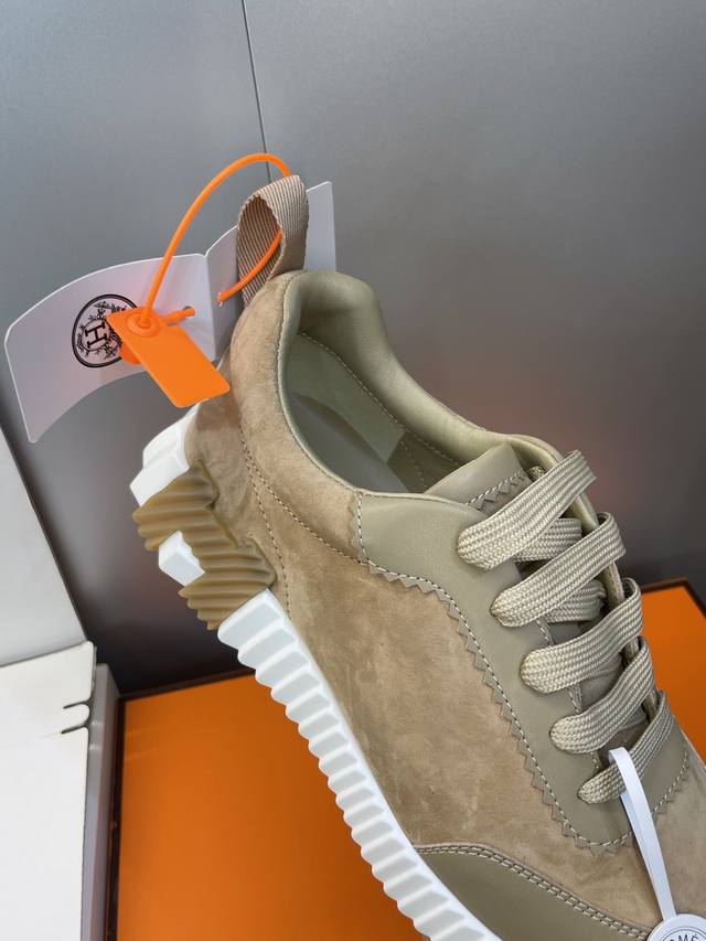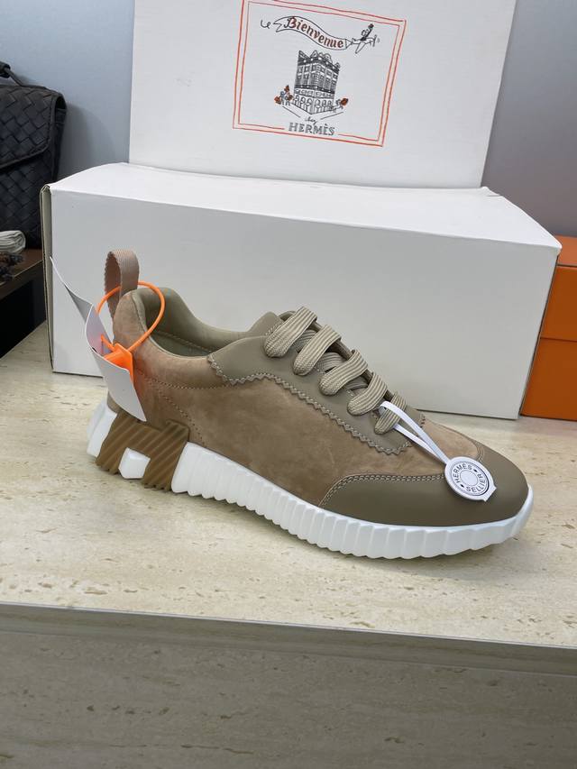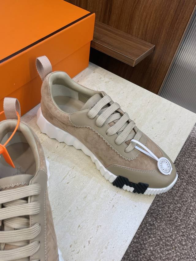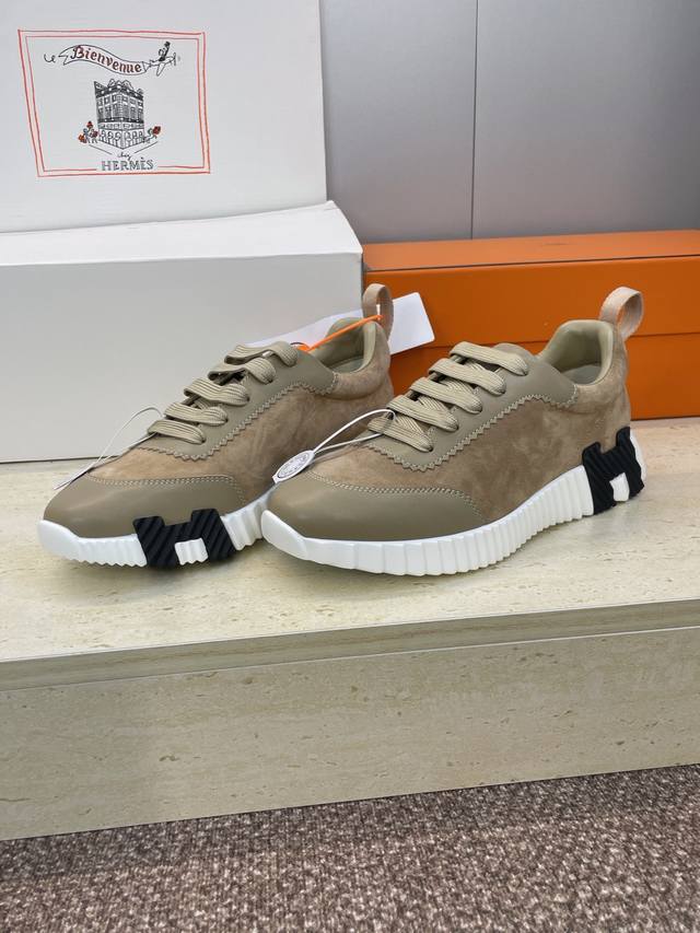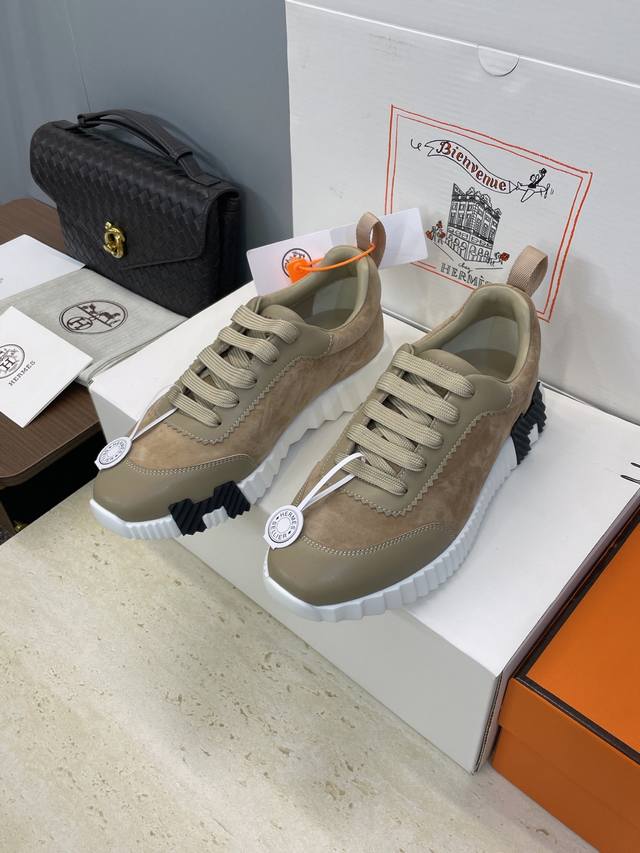 工厂P价P 配全套飞机盒 莞货 顶级版 爱马仕 Hermes 2025秋冬经典情侣款 Bouncing 休闲系带百搭运动鞋 H家厚底时尚风格拼色跑鞋 材质:鞋面