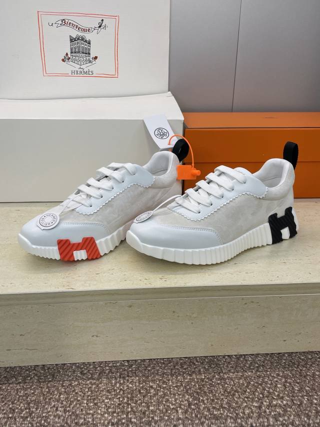 / 工厂P价P 配全套飞机盒 莞货 顶级版 爱马仕 Hermes 2025秋冬经典情侣款 Bouncing 休闲系带百搭运动鞋 H家厚底时尚风格拼色跑鞋 材质:鞋面