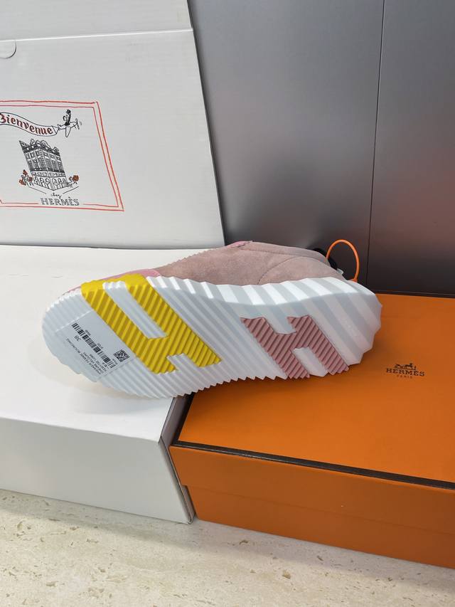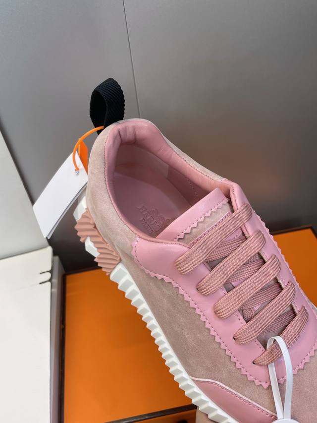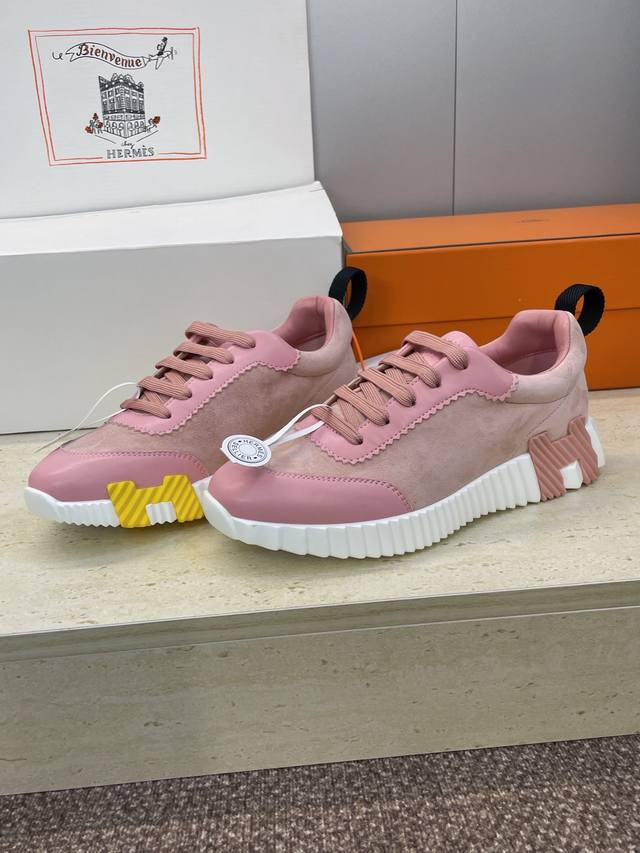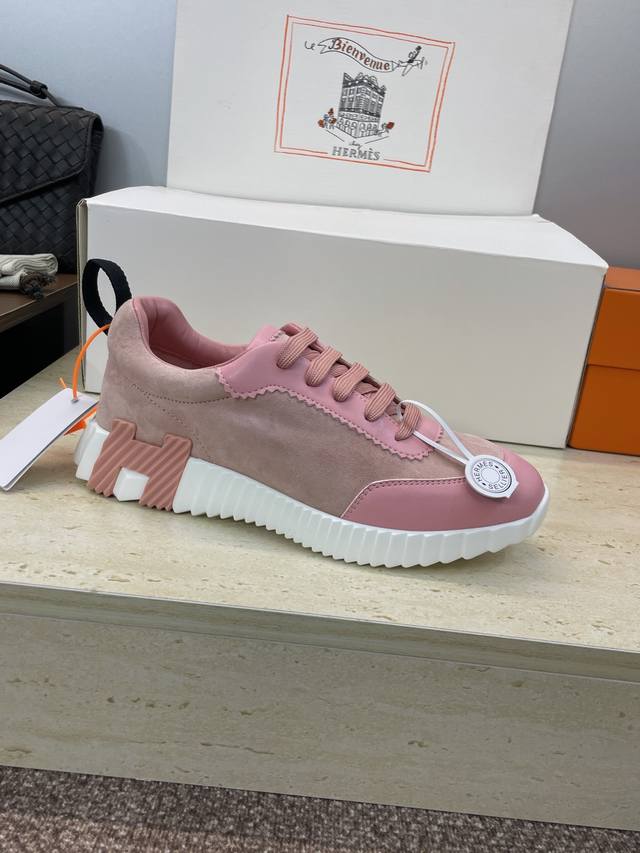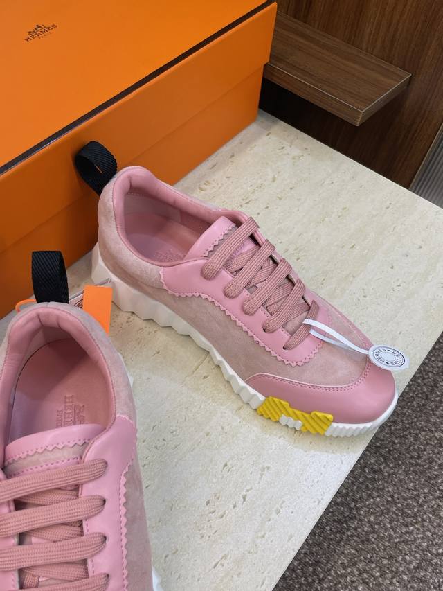 工厂P价P 配全套飞机盒 莞货 顶级版 爱马仕 Hermes 2025秋冬经典情侣款 Bouncing 休闲系带百搭运动鞋 H家厚底时尚风格拼色跑鞋 材质:鞋面