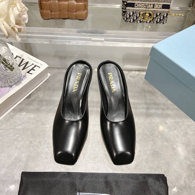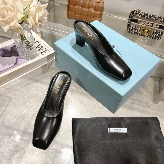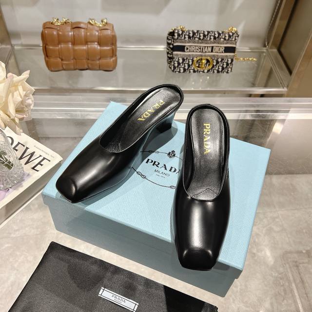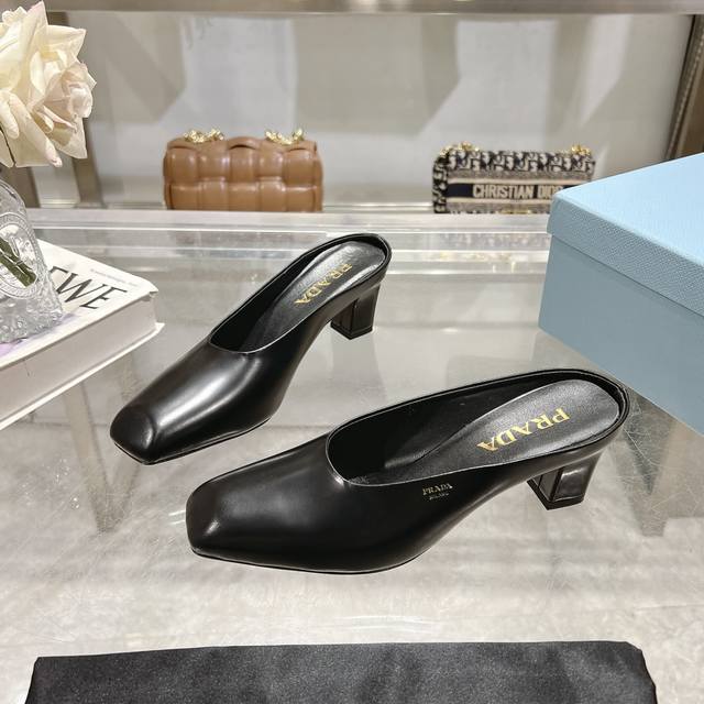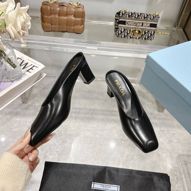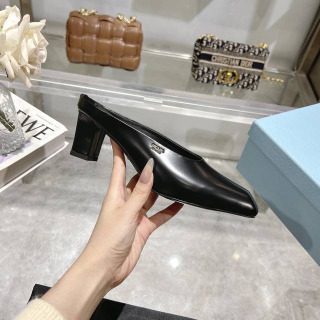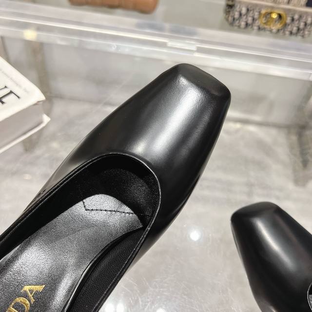 / 工厂P价P ,25年新款上市走秀明星新品时尚潮流 Prada 普拉达 方头高跟方跟粗跟凉鞋后空单鞋。鞋面采用进口牛漆皮,开边珠、内里垫脚为进口羊皮,意大利注塑真