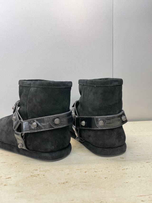 工厂P价P Balenciaga 2025秋冬新款朋克风格防寒保暖羊皮毛一体女靴 巴黎世家明星同款字母Logo厚底圆头铆钉皮带扣雪地靴 材质:鞋面进口牛猄皮+1