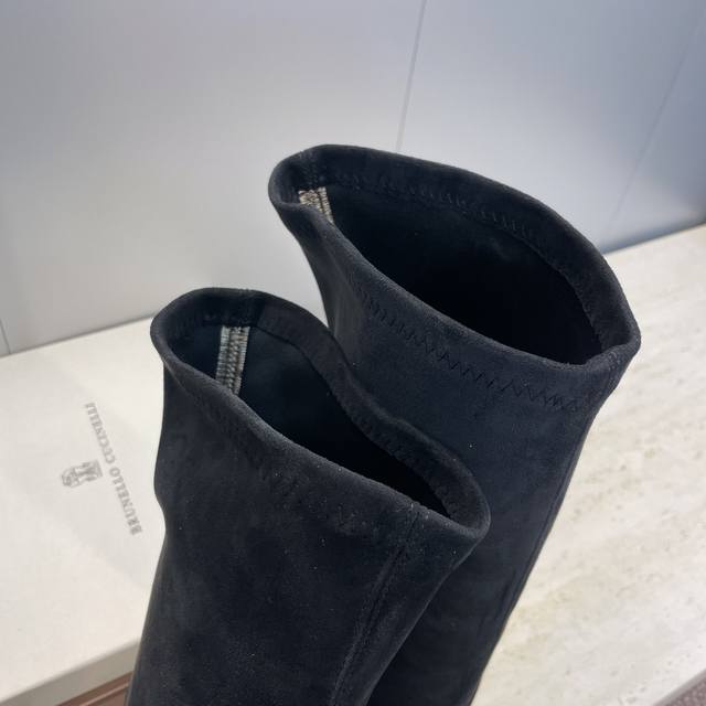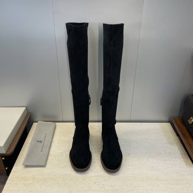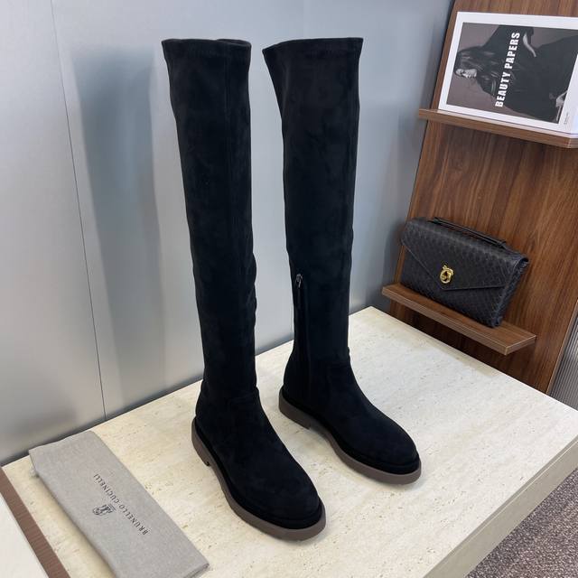 工厂P价P Brunello Cucineli 布鲁内诺库奇内利2025秋冬新款游牧风格保暖高筒女长靴 Bc 厚底圆头侧拉链一脚蹬过膝弹力机车骑士靴 材质:鞋面