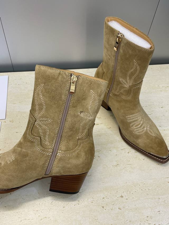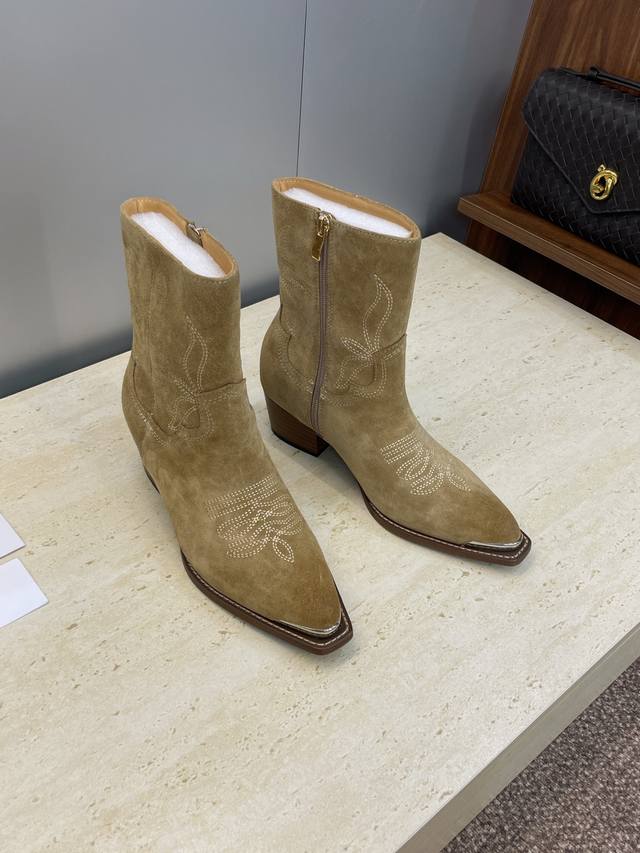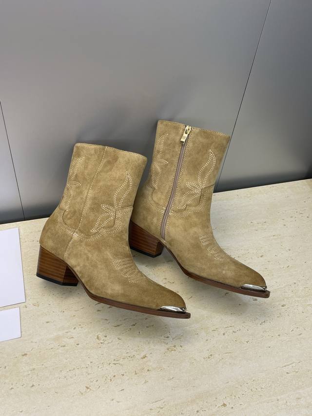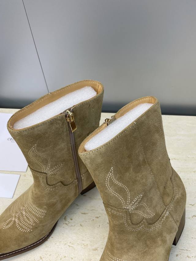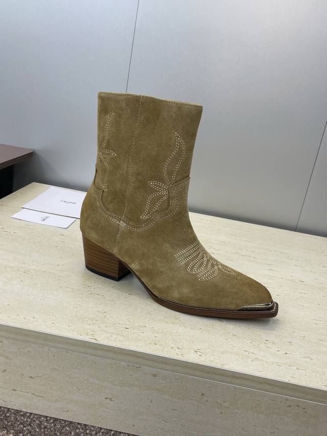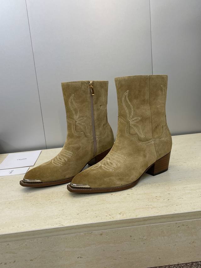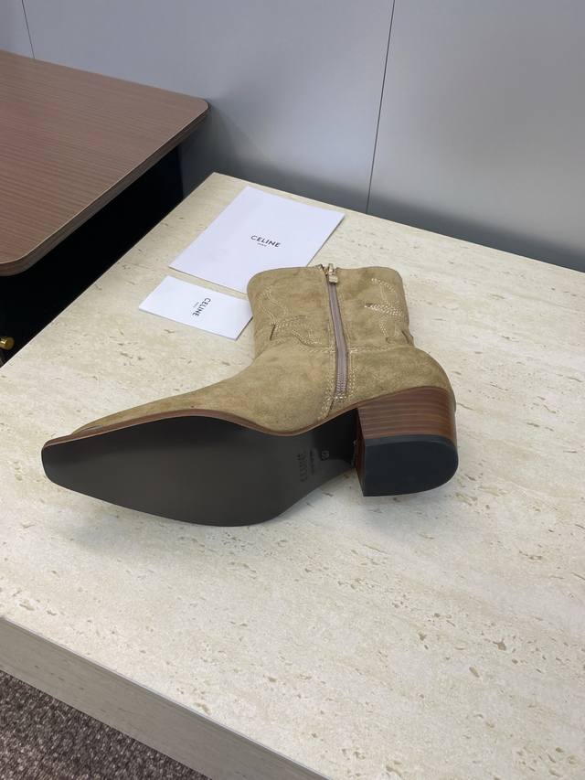工厂P价P Celine 2025秋冬新款朋克风格铁头机车电绣女短靴 瑟琳字母Logo五金扣粗跟侧拉链尖头骑士靴 材质:鞋面定制进口小牛皮 进口羊猄皮+水染牛皮
