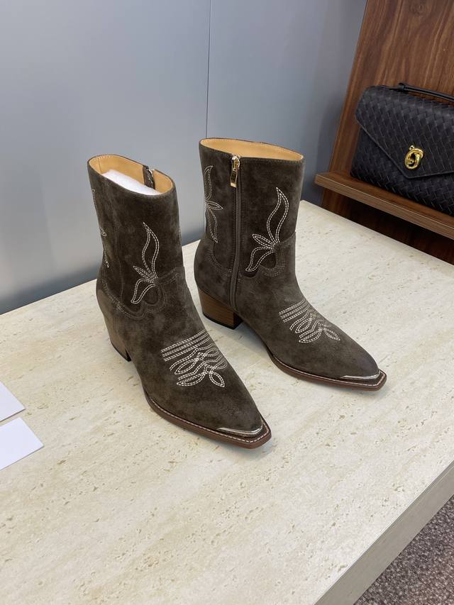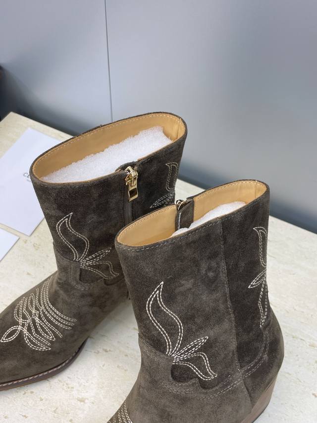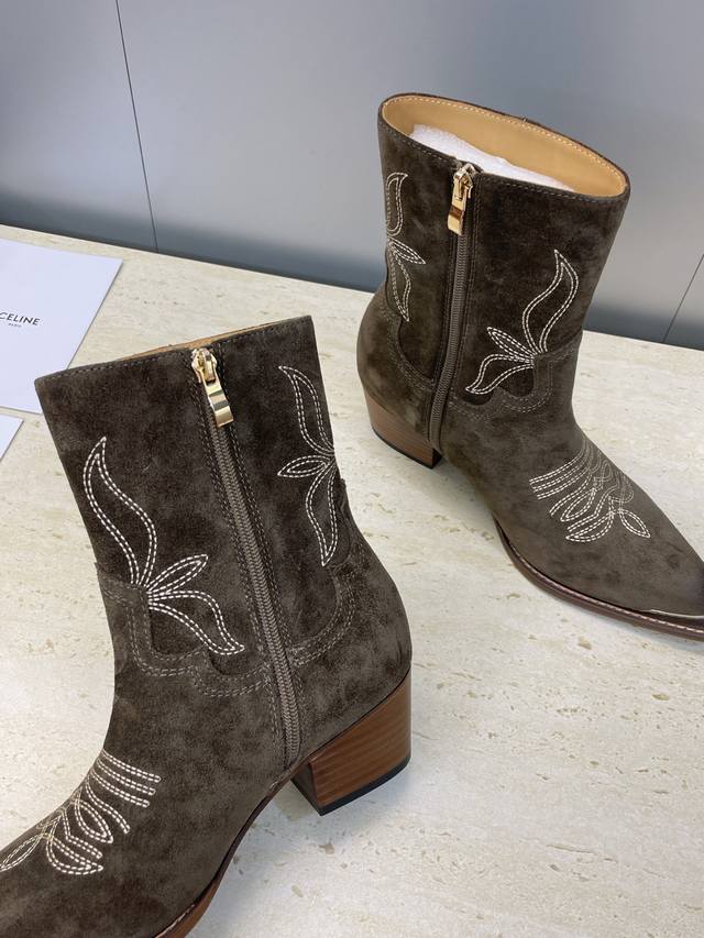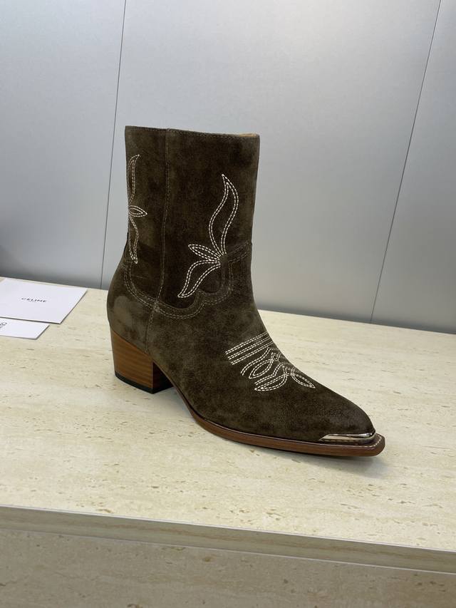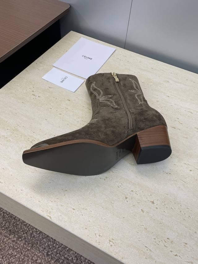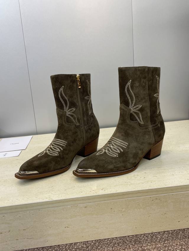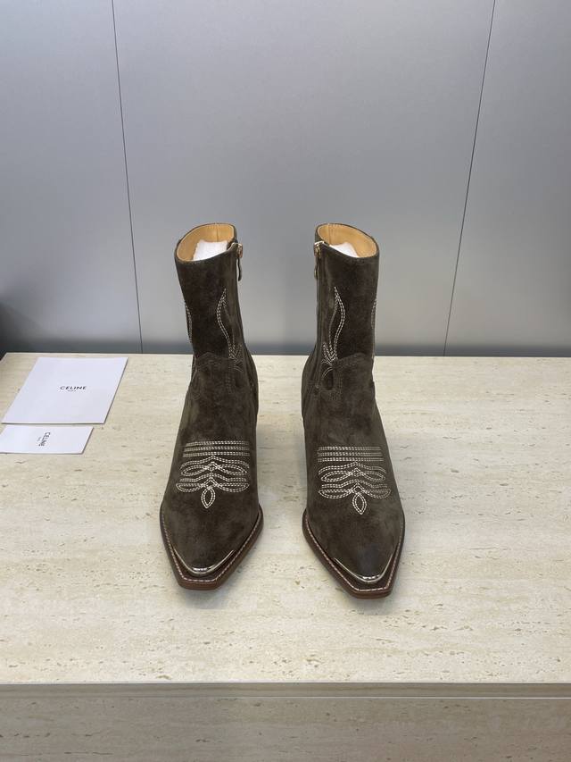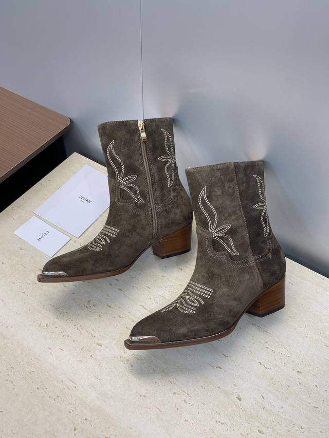/ 工厂P价P Celine 2025秋冬新款朋克风格铁头机车电绣女短靴 瑟琳字母Logo五金扣粗跟侧拉链尖头骑士靴 材质:鞋面定制进口小牛皮 进口羊猄皮+水染牛皮