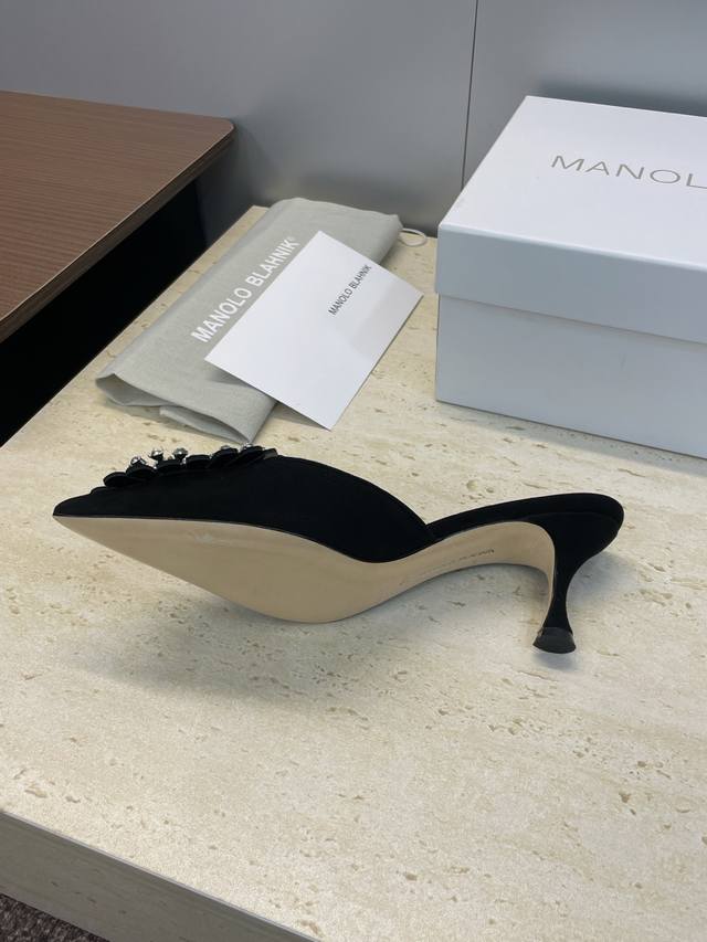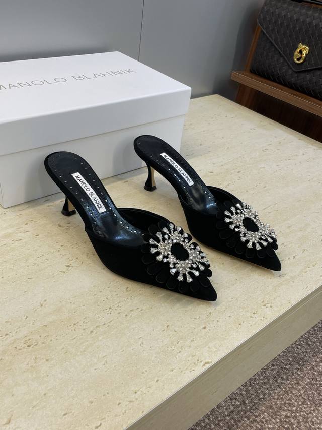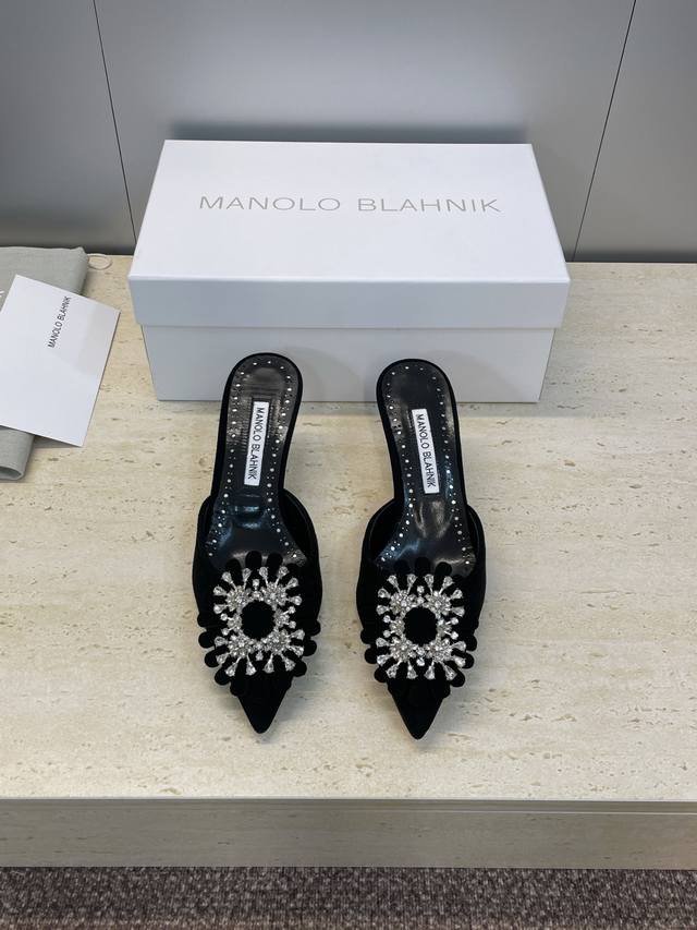 / 工厂P价P Manolo Blahnlk 2025春夏新款中跟女鞋 Mb尖头水钻花朵穆勒凉拖鞋 材质:鞋面进口羊猄皮+水染羊皮内里+进口澳洲水钻+意大利真皮大底