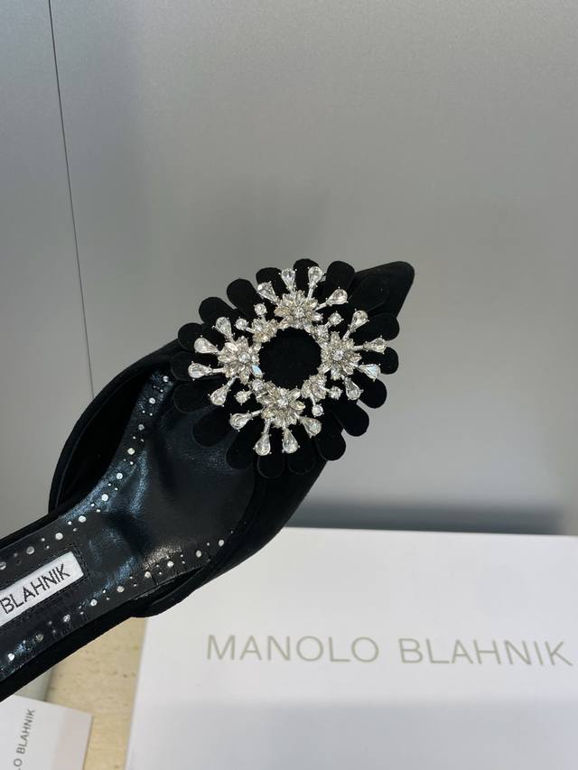 工厂P价P Manolo Blahnlk 2025春夏新款中跟女鞋 Mb尖头水钻花朵穆勒凉拖鞋 材质:鞋面进口羊猄皮+水染羊皮内里+进口澳洲水钻+意大利真皮大底