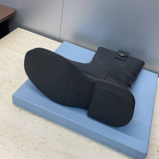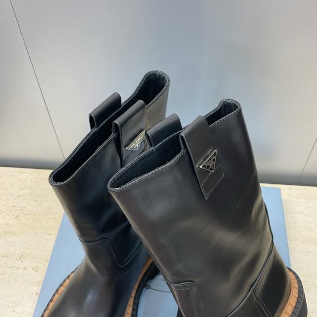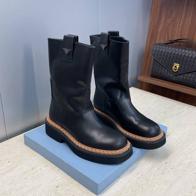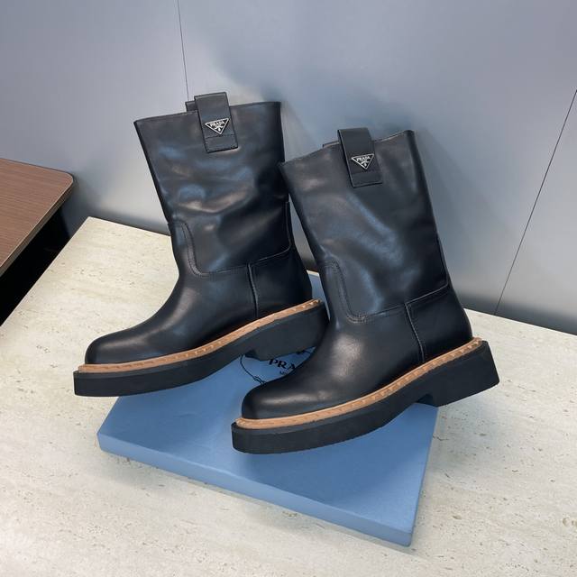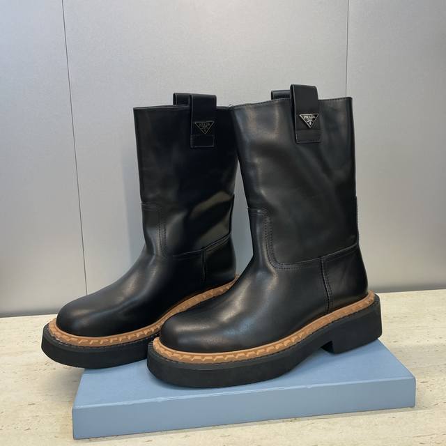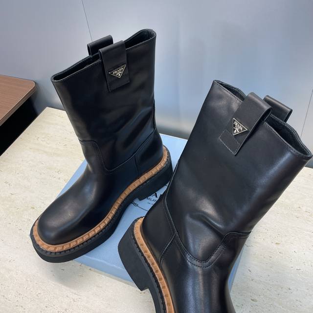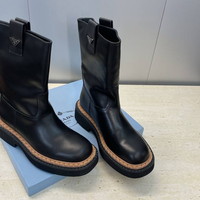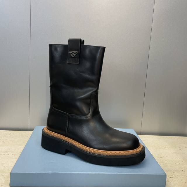 / 工厂P价P Prada 普拉达 2025秋冬新款朋克风格低跟中筒机车女短靴 明星同款厚底圆头标志性字母Logo三角徽章一脚蹬拼色骑士军靴 市面顶级高端版本 材质