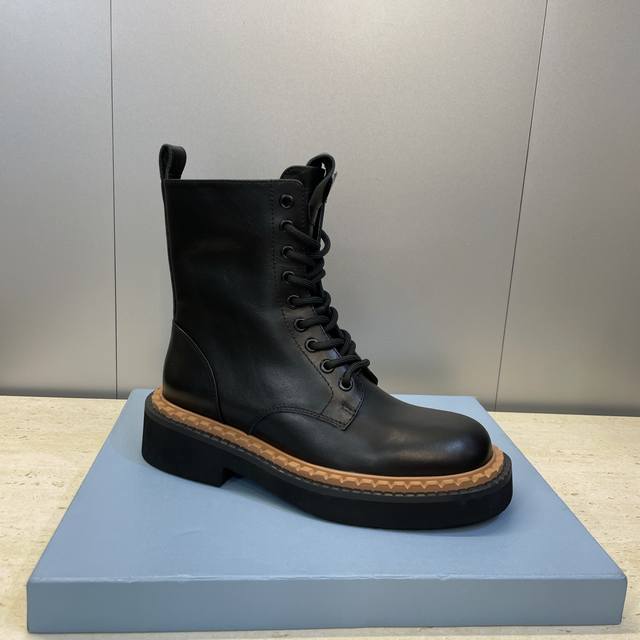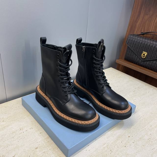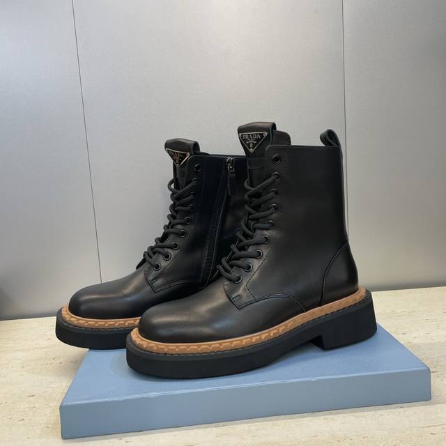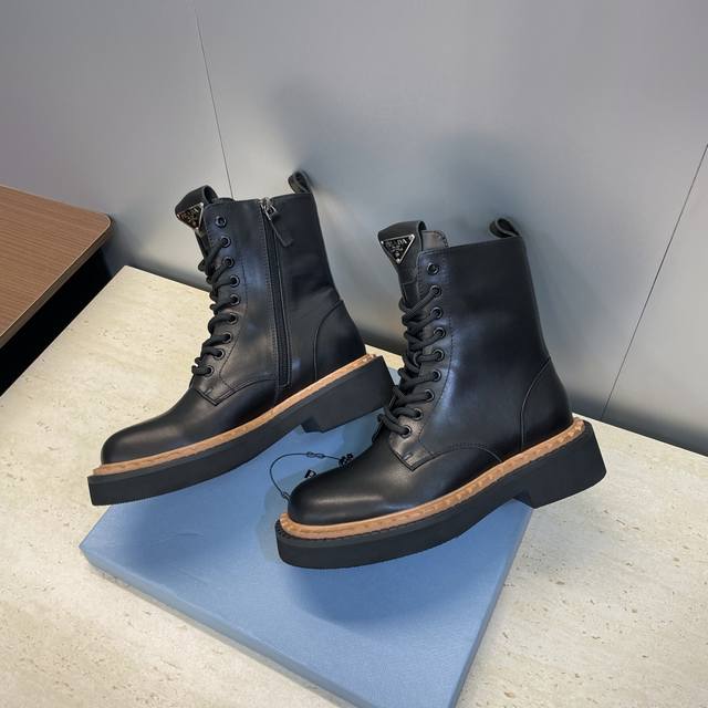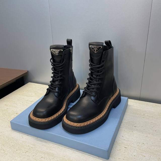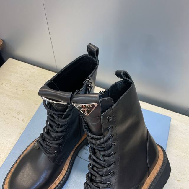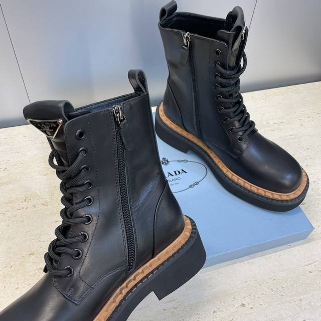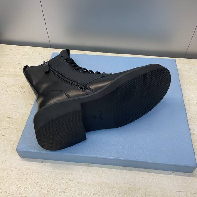 工厂P价P Prada 普拉达 2025秋冬新款朋克风格侧拉链低跟机车女短靴 明星同款厚底圆头标志性字母Logo三角徽章系带拼色骑士军靴 市面顶级高端版本 材质